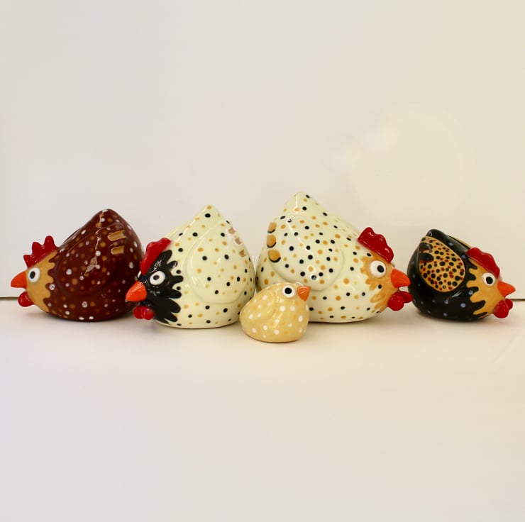 I have made a series of these fun chickens from white stoneware clay. Each one is handmade from scratch (no moulds) so they are all unique.