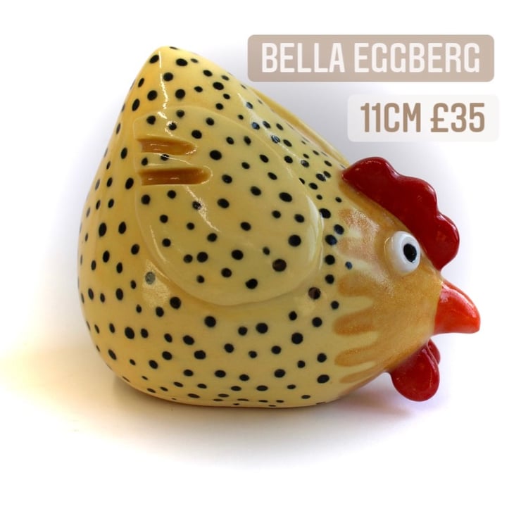 After biscuit firing to 950 degrees the chickens are hand painted with underglazes and finished with a shiny clear glaze. A long firing to 1220 degrees ensures that these little chooks are frost resistant and so they can be displayed indoors or out.