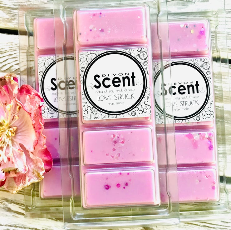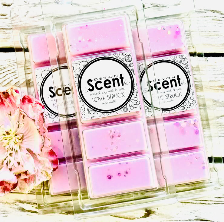 Our highly fragranced Love Struck Snap Bar Wax Melts open with the fruity scent of pink guava, melon, grapefruit, lemon and plum leading to a floral heart of Jasmin, lily, rose, violet and freesia on a musky base with additional notes of cedar, patchouli, amber and vanilla.