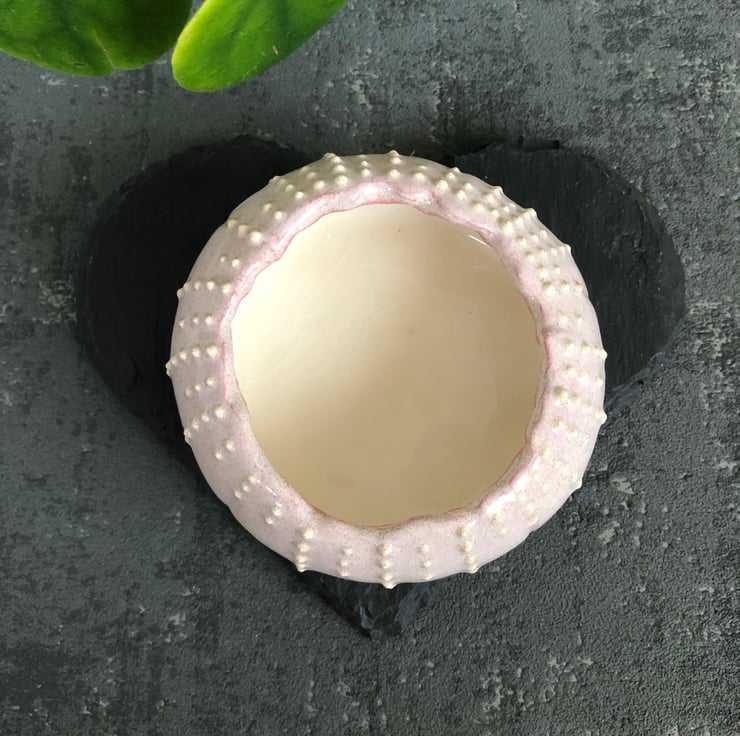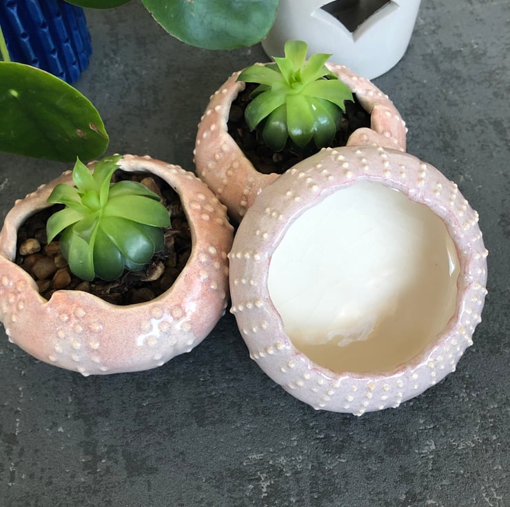 Made with a white earthenware clay and glazed in the subtlest of lilac whites and accented with pink under glazed veins, these planters are inspired by the native British sea urchin, and the coastlines I am so lucky to be surrounded by.