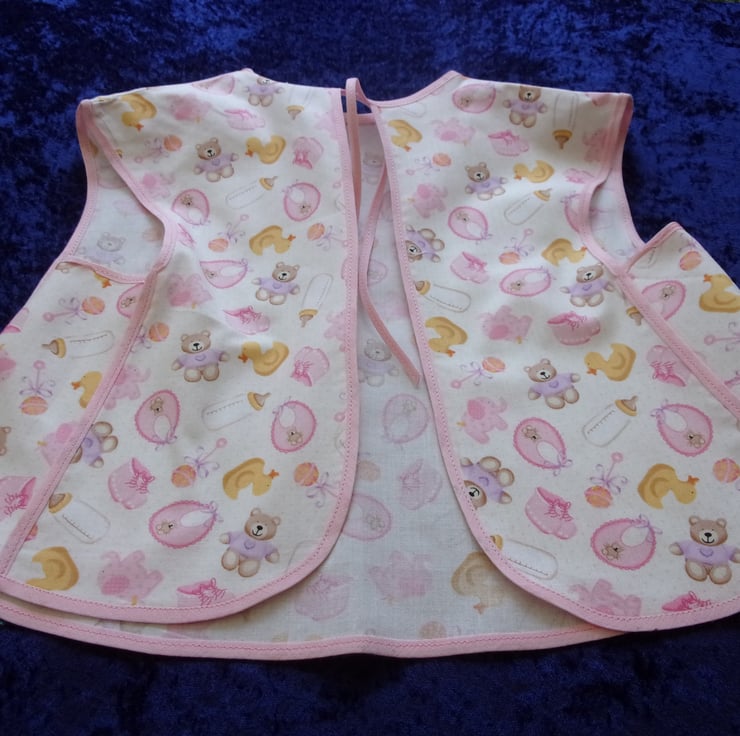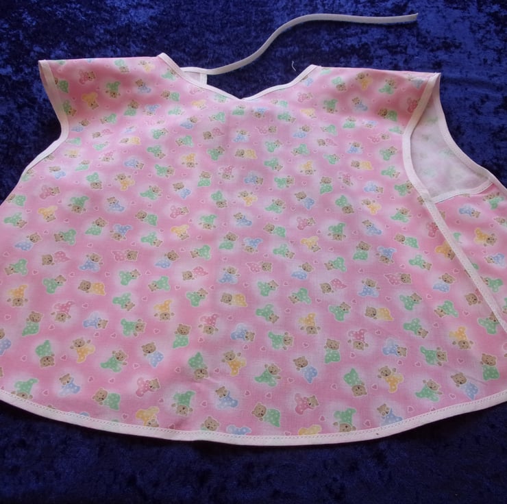 This Cover Up is suitable for a child / baby of 1-2 years of age. It is has gussets at the side and is edged with a contrasting bias binding which is also used for the ties at the back.