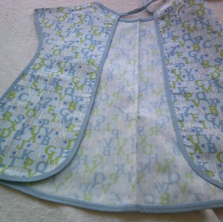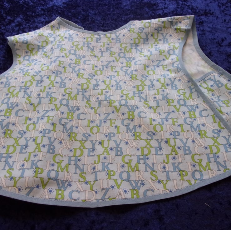 This Cover Up is suitable for a child / baby of 1-2 years of age. It is has gussets at the side and is edged with a contrasting bias binding which is also used for the ties at the back.