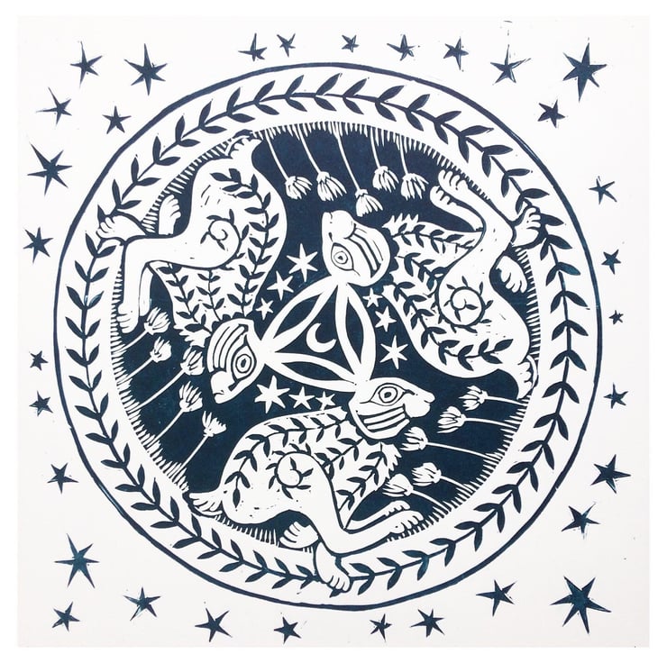The print is based on an old and heavily symbolic design featuring three hares sharing three ears between them. This optical illusion has been found at sacred sites as far away as ancient China.