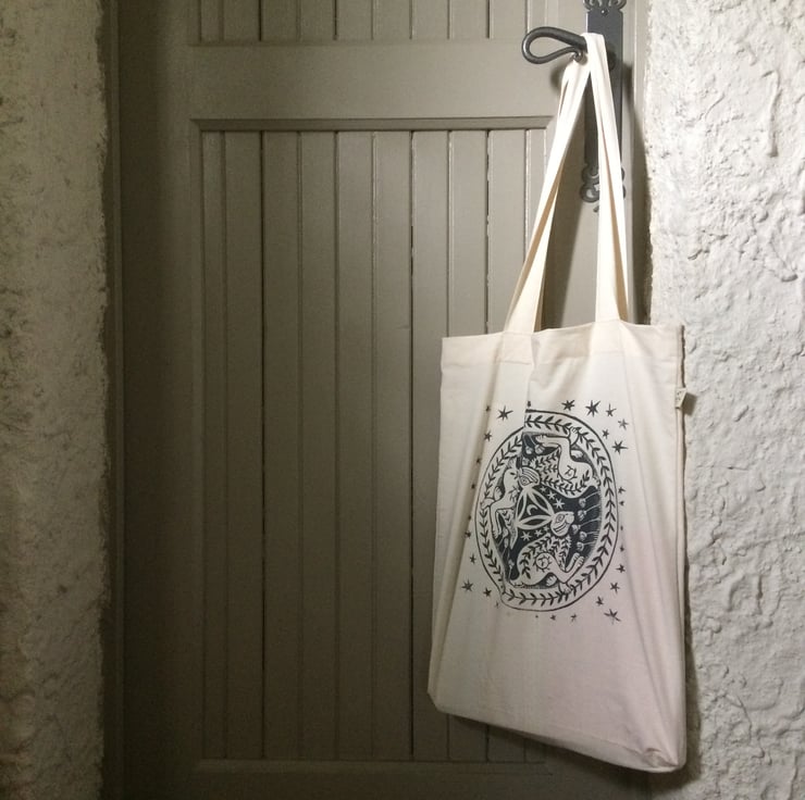 Based on my lino print design, my 'Three Hares' tote is hand screen printed in a dark slate grey. The tote is eco friendly, unbleached 100% organic cotton and measures a roomy 35cm x 40cm with long handles suitable for wearing over the shoulder. The bag will be neatly folded and wrapped in protective tissue before being posted out, a perfect gift for an environmentally conscious nature lover... fancy one Greta? (There might be slight print imperfections due to it being hand printed but this only adds to the charm!)