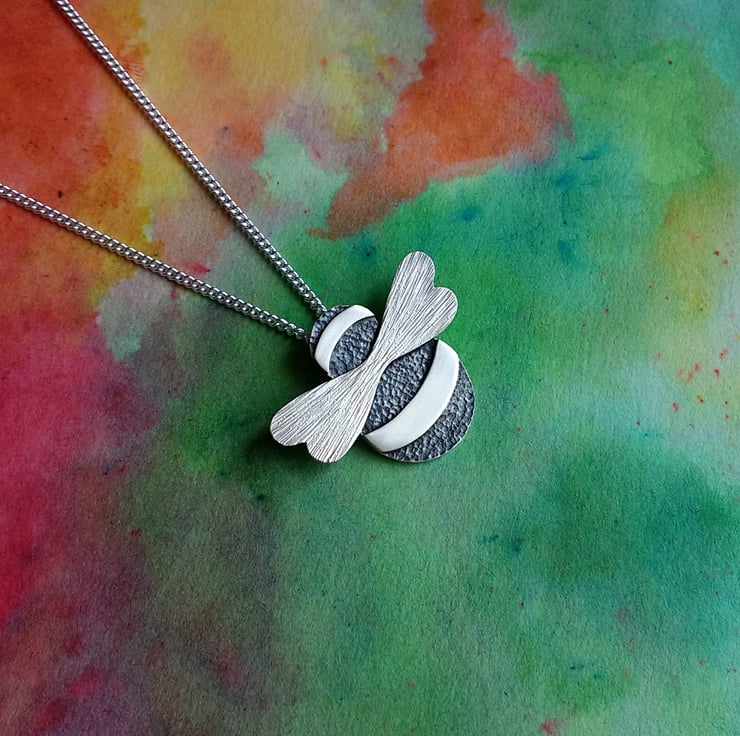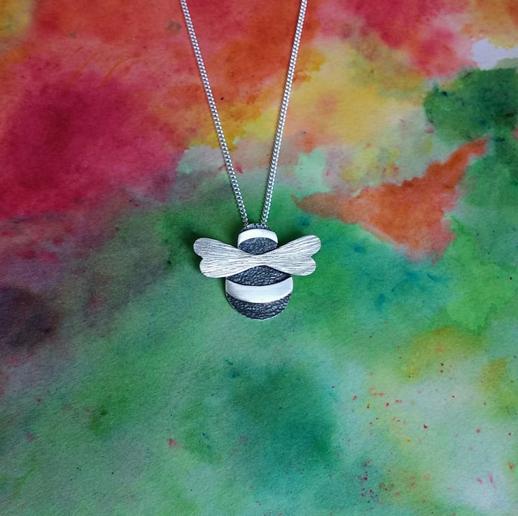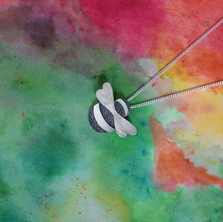 Handmade in our North Yorkshire studio, this beautiful Bumble Bee Necklace/Pendant is made from Sterling Silver and has a dimpled textured body which has been oxidised to add contrast and definition, smooth Silver stripes and textured Silver wings. It has a concealed tube at the back which the Sterling Silver Curb Chain is threaded through (Please select your desired chain length at checkout). The Bee is created completely by hand and the textures are hand hammered so each Bee is unique.