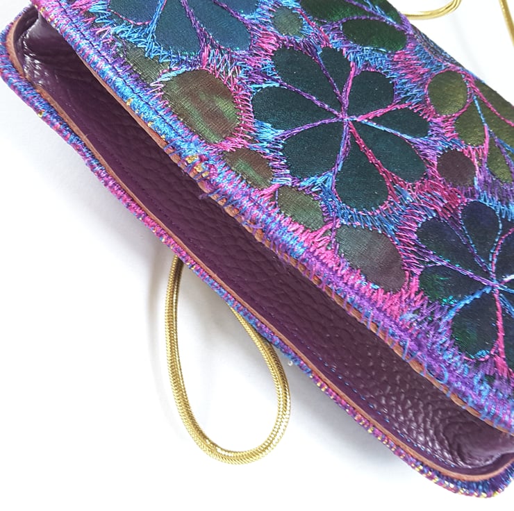It has a magnetic clasp and a leather gusset on the side of the bag