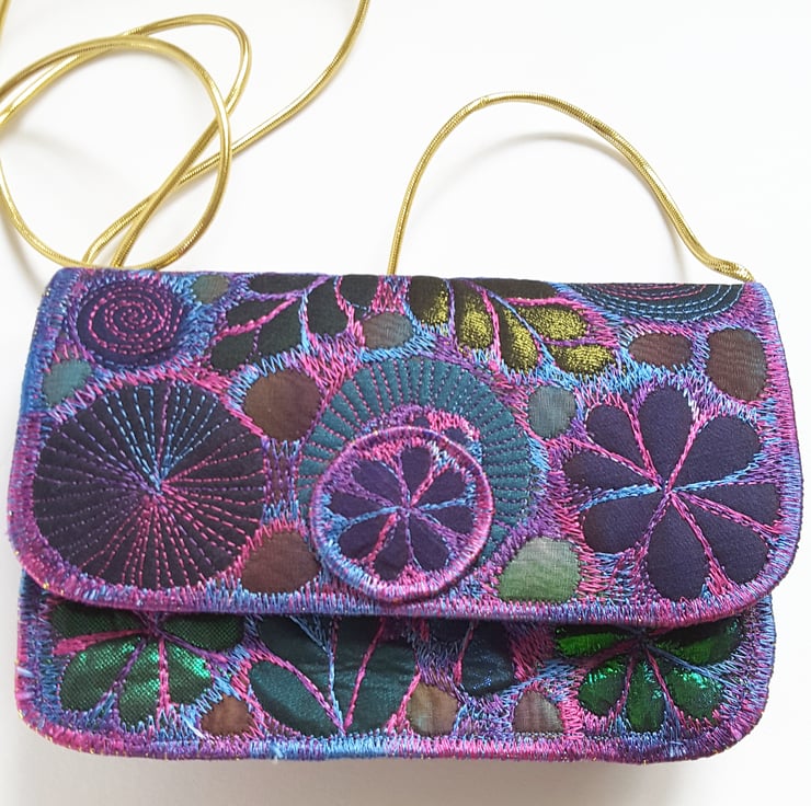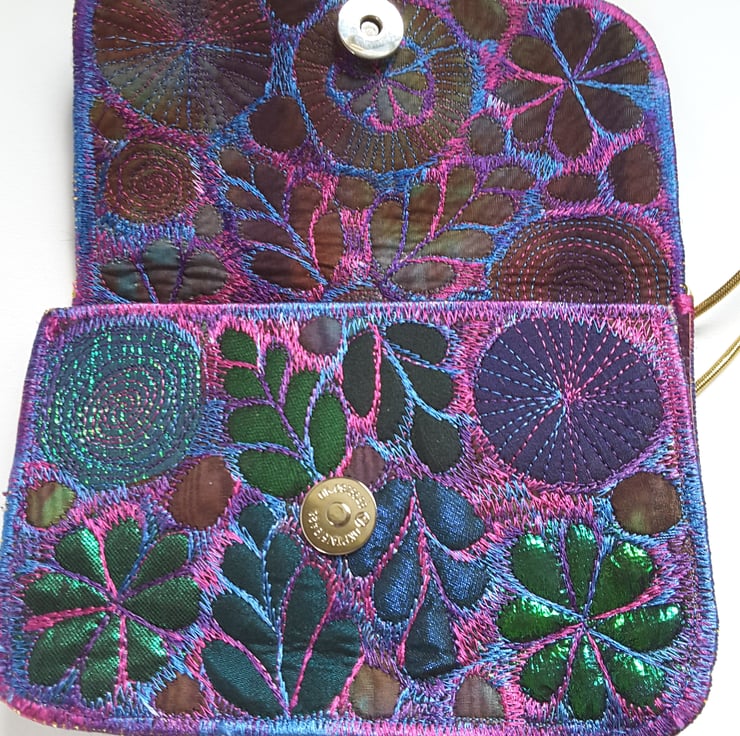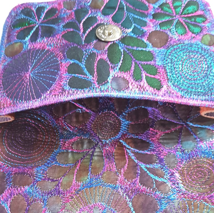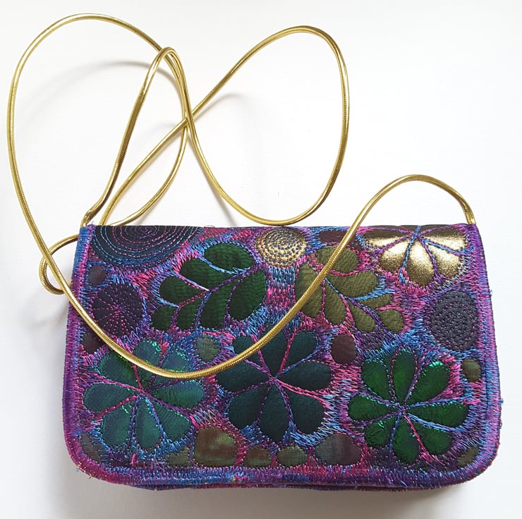 Made from layers of fabric including hand dyed Egyptian cotton and silk fabrics using the free machine embroidery style of sewing.