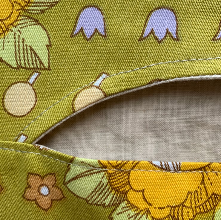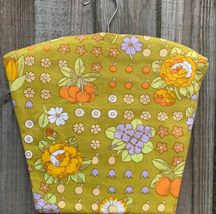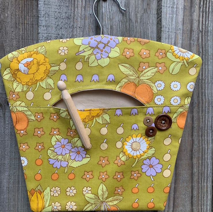 Pretty cotton peg bag in retro fabric reclaimed from a curtain. The peg bag is fully lined in cream reclaimed cotton and trimmed with 3 buttons.