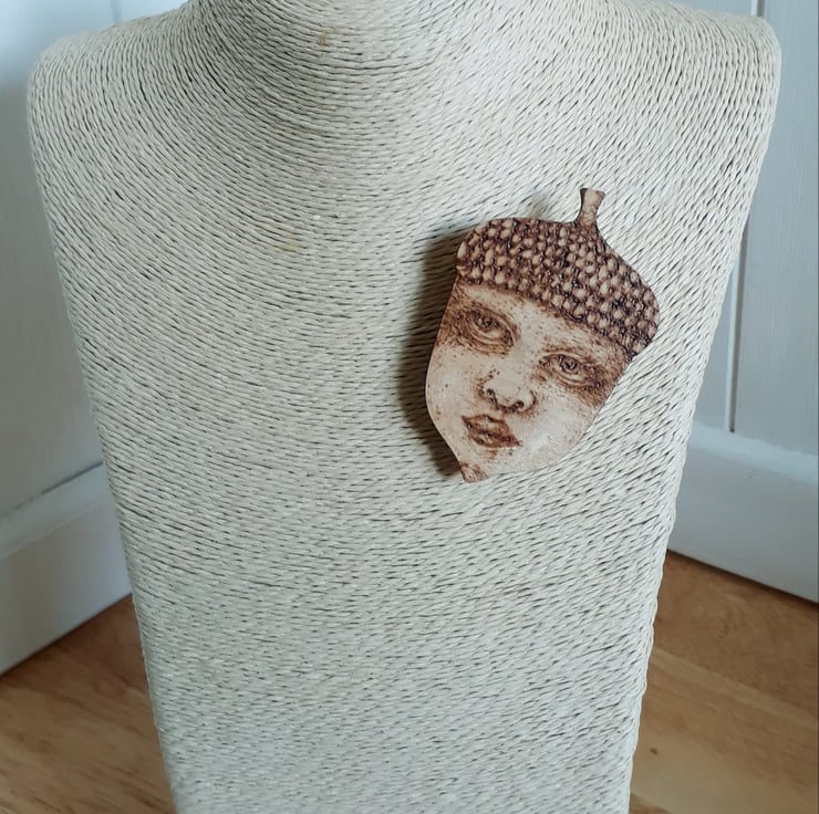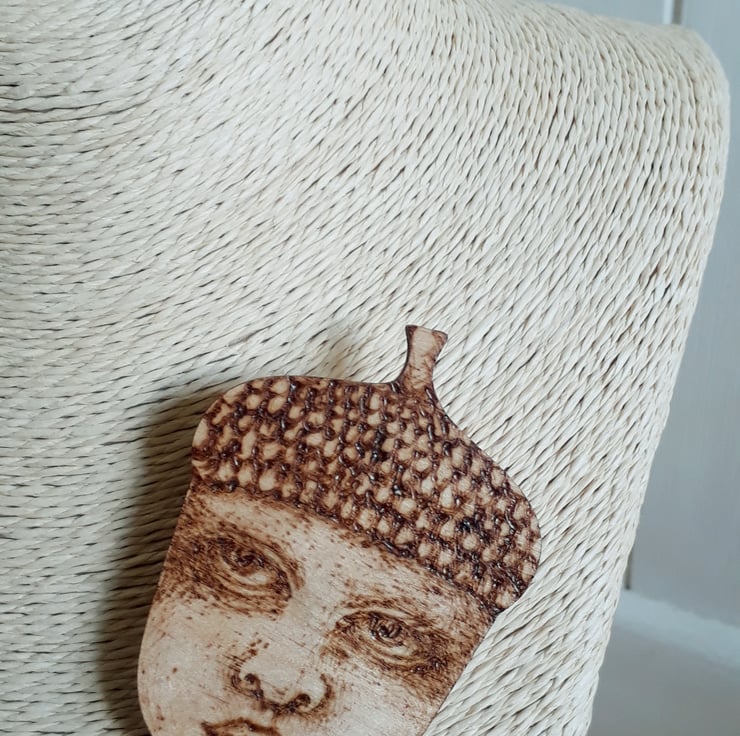 Wooden brooch of Lady Acorn decorated using pyrography (wood burning).