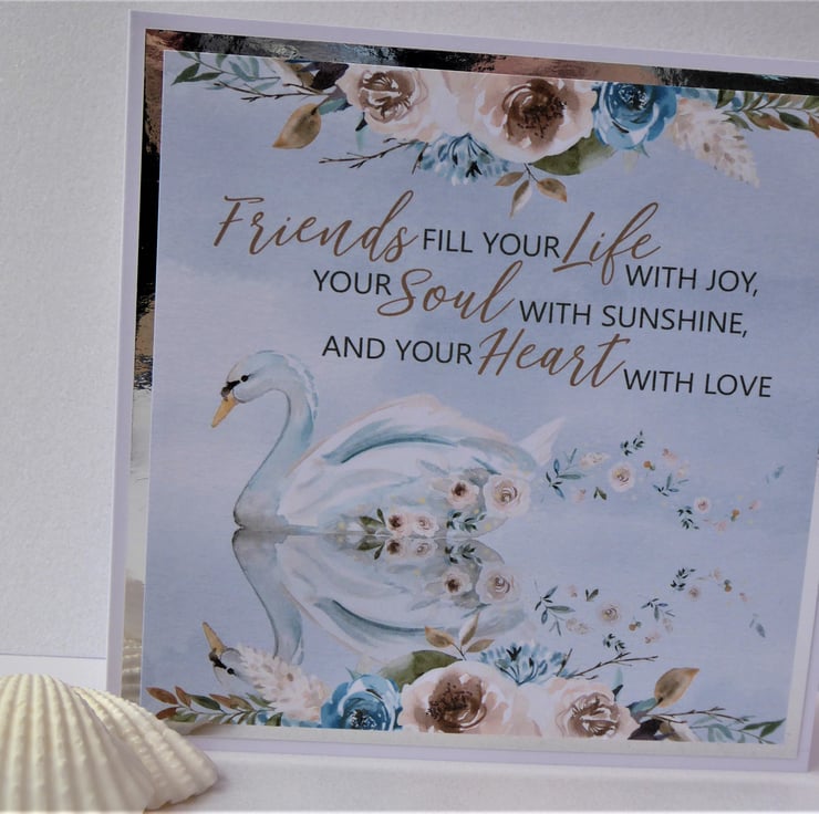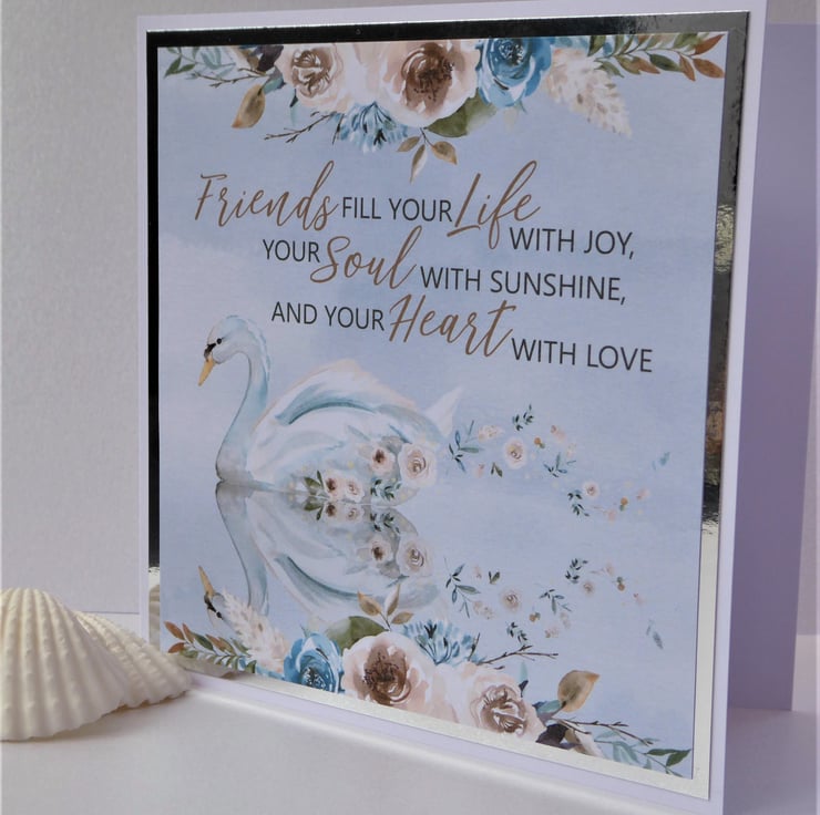 A lovely card for a friend made from 300gsm white card. Printed image of a swan and flowers layered up onto silver mirror card before attaching to the front of card.