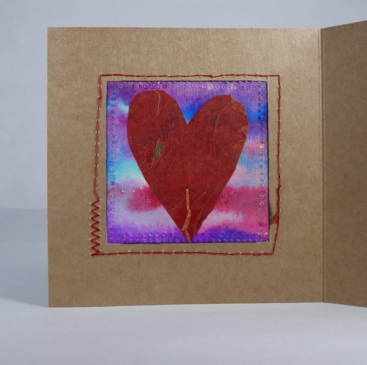 On the inside of the card there has been a square cut out to show the back of the heart. One red heart made from handmade paper.