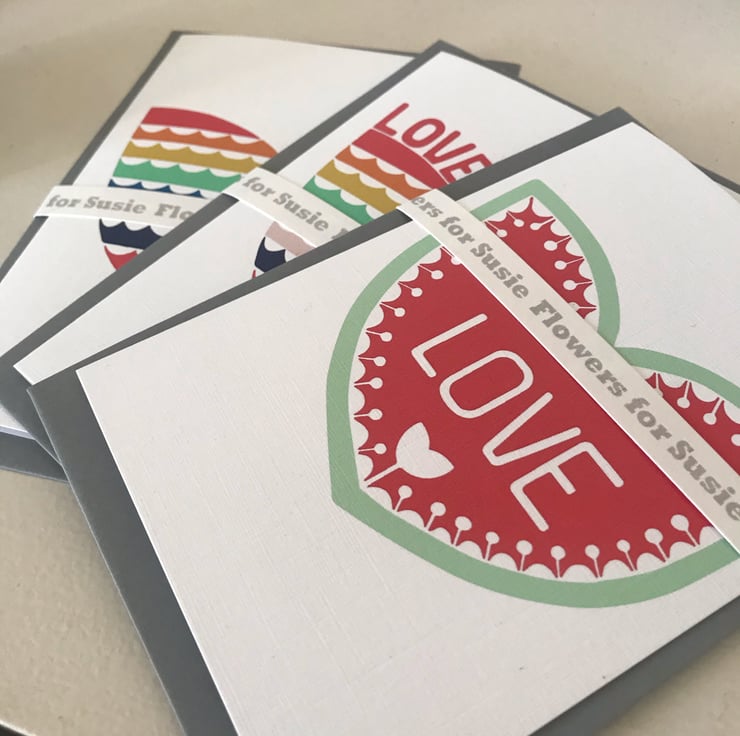 Each A6 card is a premium inkjet print on high quality 260gsm matt white linen textured card and comes with a premium grey envelope. The cards and envelopes are bound by a paper band making the cards and their packaging totally recyclable.