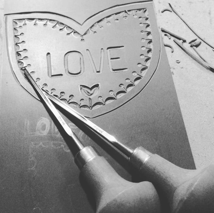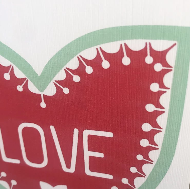 As with all my cards and prints the 'Big Heart' design started life as a little sketch in my sketchbook, the design was then cut in lino and printed by me so the design has a beautiful, simple block print style that is retained in the final card design. All my designs are created in my little studio by the sea.