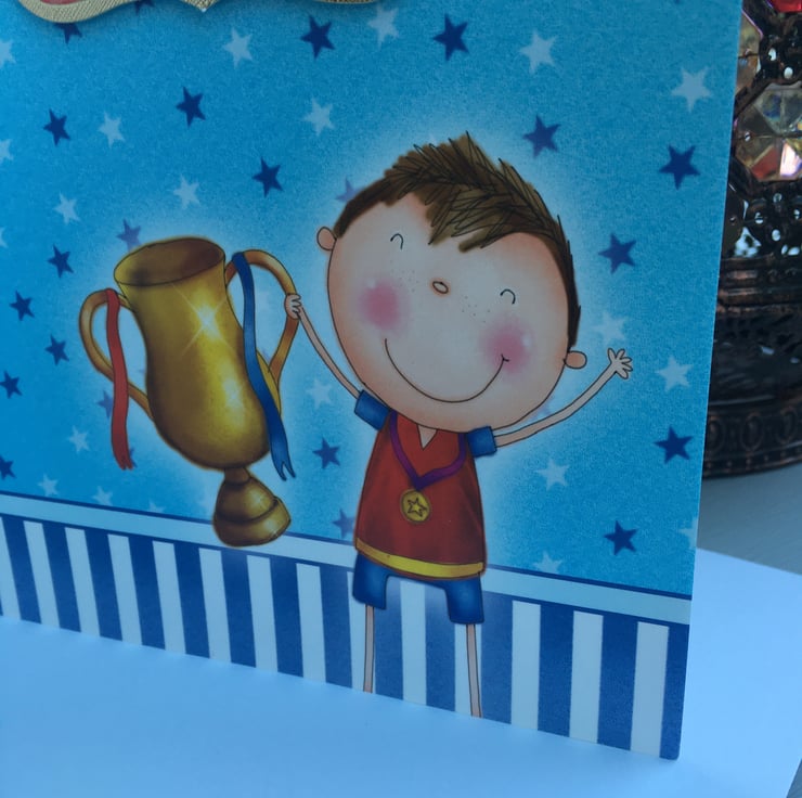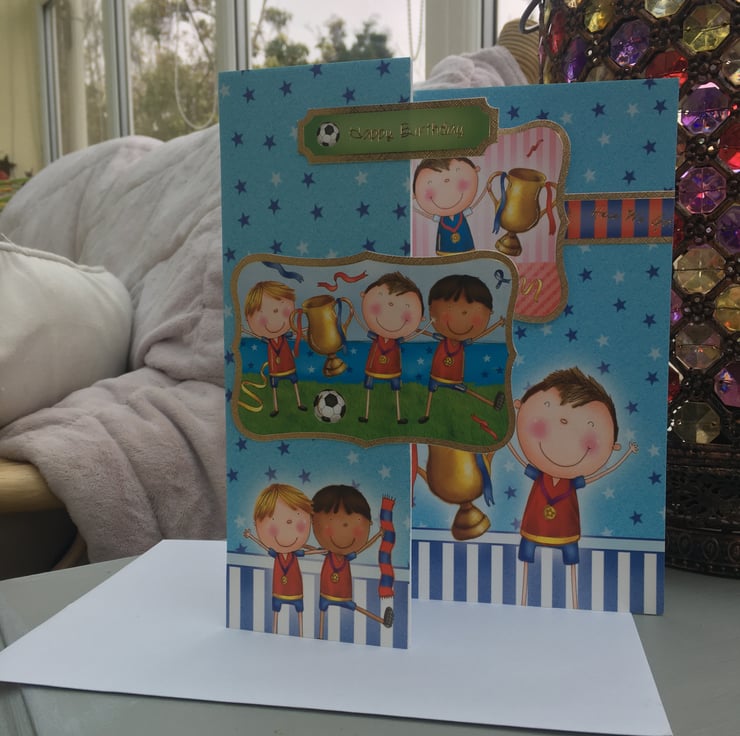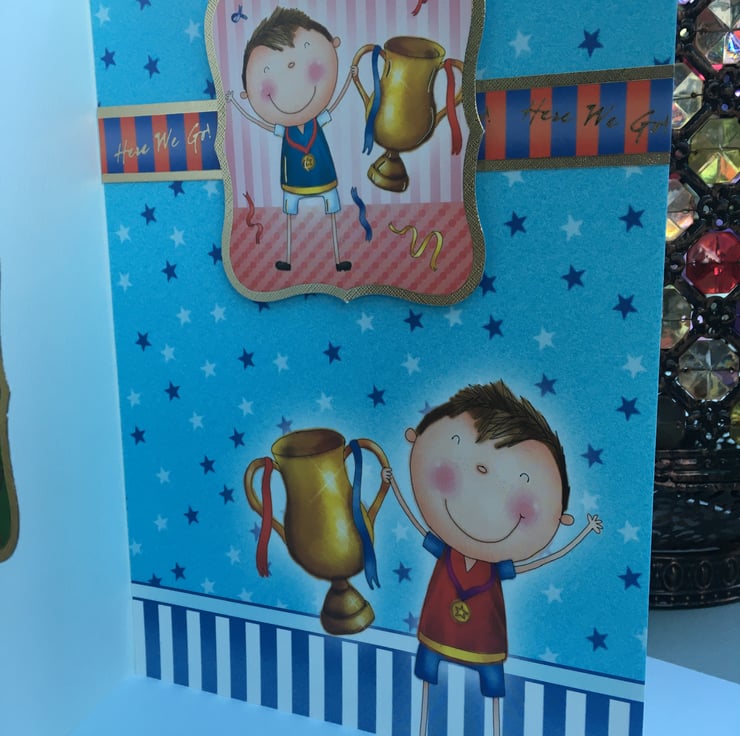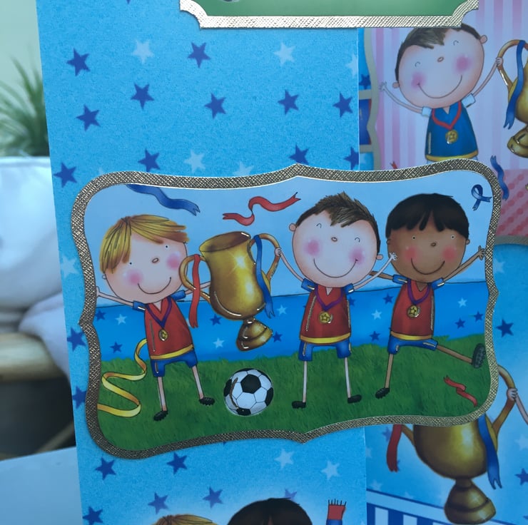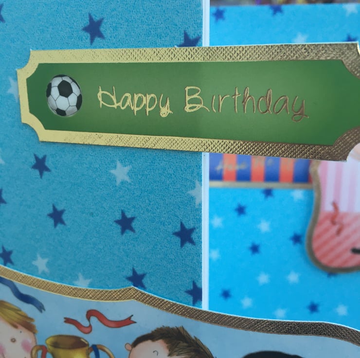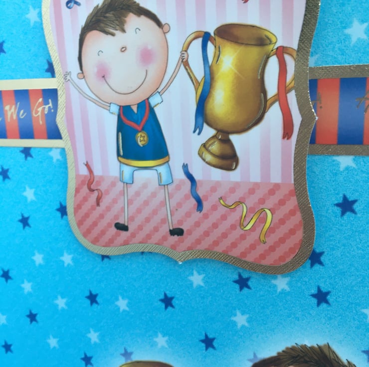 A quirky card for your little champ. An A4 sized card with a fold back front, this card has lots of little football players who have just won the cup. The base card is blue with stars all over it, it has a blue and white striped border at the base. There are cheering players holding a cup and scarves. There are 2 toppers with futher players on them. The greeting is Happy Birthday.