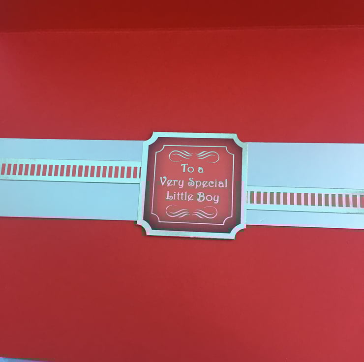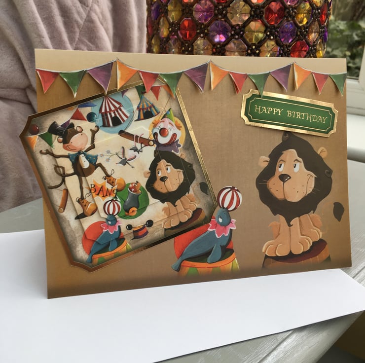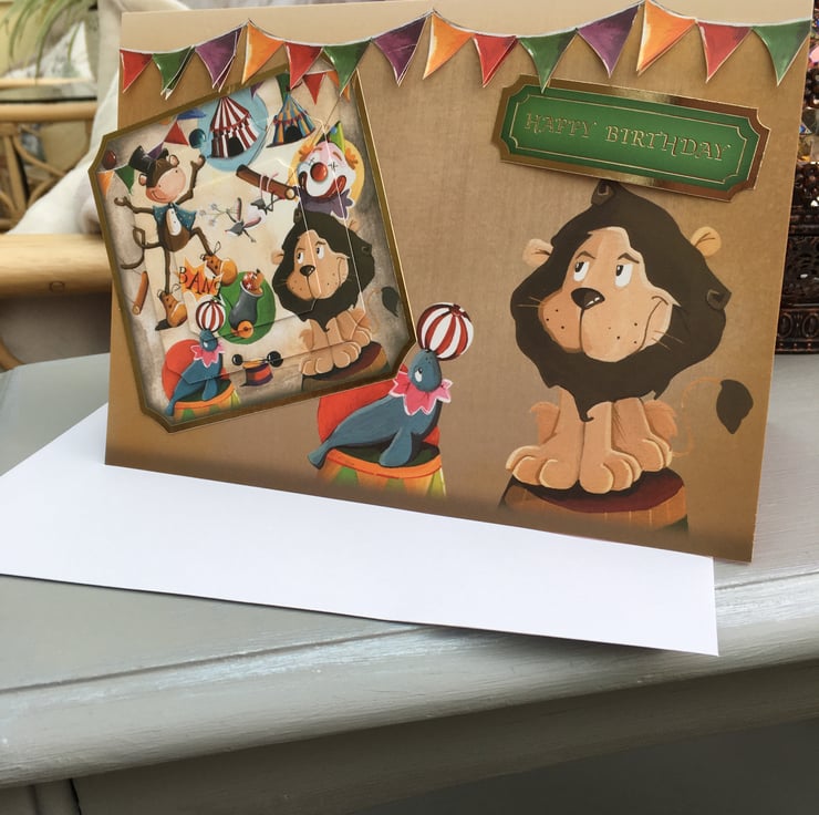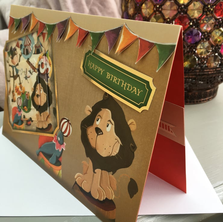 Jolly circus fun to celebrate a little boys birthday. This A4 card has a lovely friendly lion and seal on the front. A matching topper has a circus scene with the lion, a monkey, a clown, big top and the seal balancing a ball on his nose. This is a layered topper with a gold border. Bright bunting swags across the top and a Happy birthday greeting finishes the design. Inside the card is red with a gold border. The greeting says to a very special little boy.