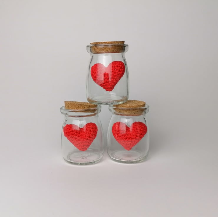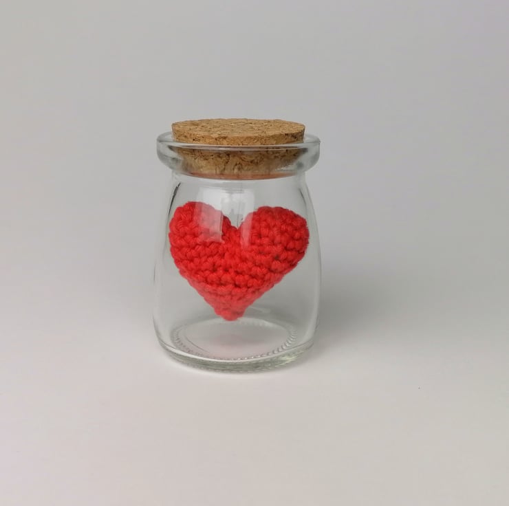 Handmade crochet heart in a glass jar. Height: 7.5cm. Width, 5.5cm.