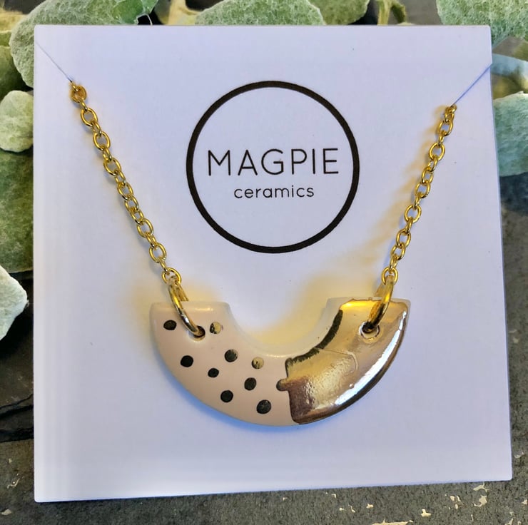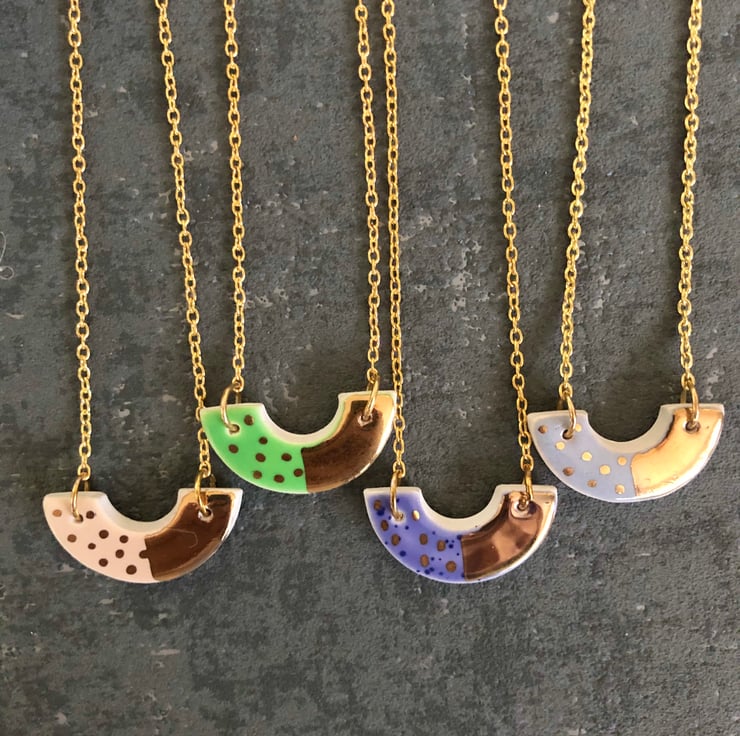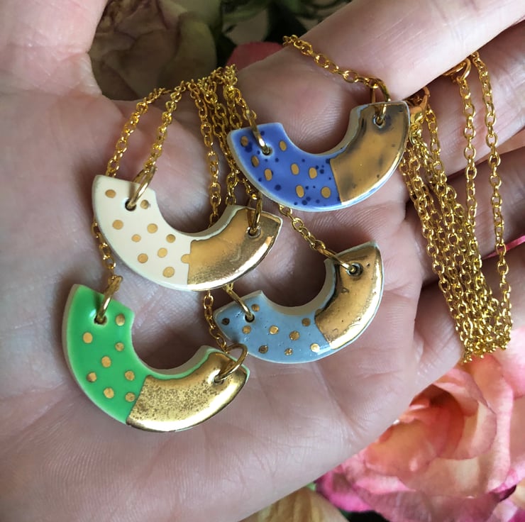 A ceramic pendant necklace made with a white earthenware clay, glazed in a vibrant glossy nude colour and finished with a genuine gold lustre decoration.