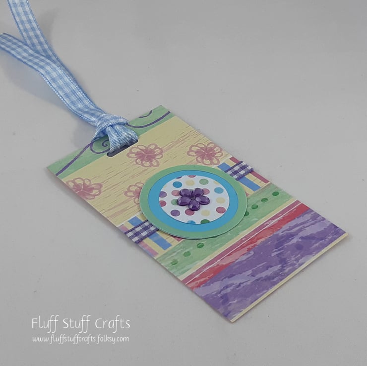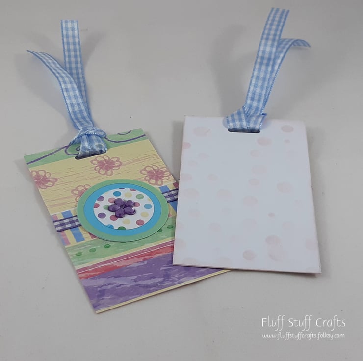 Pack of 4 gift tags in shades of pink, green, blue, yellow and purple. Each tag has a circular topper with a flower gem overlaid onto polka dot paper on a plain background with a contrasting colour circular frame. The toppers are on tags made from patterned scrapbook paper backed with white card, over a length of purple gingham ribbon. The reverse side of the tag has been lightly stencilled with a circle pattern in pale pink ink.