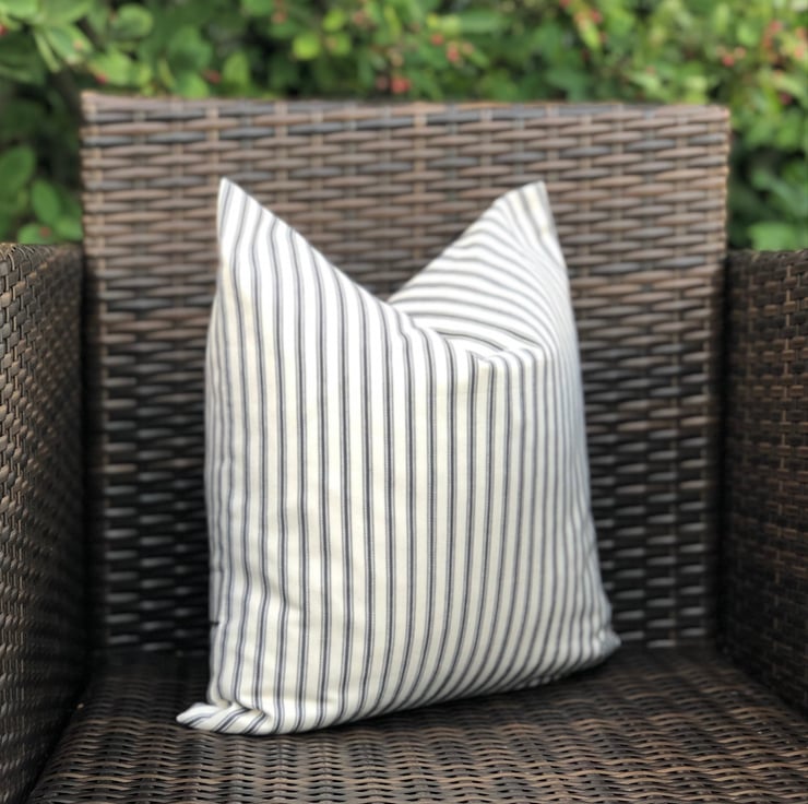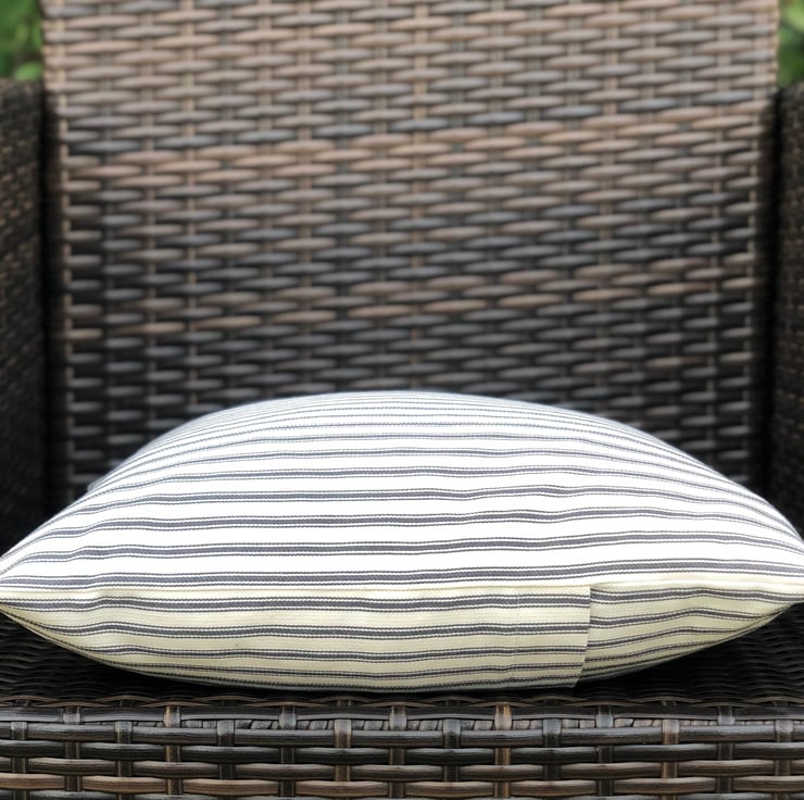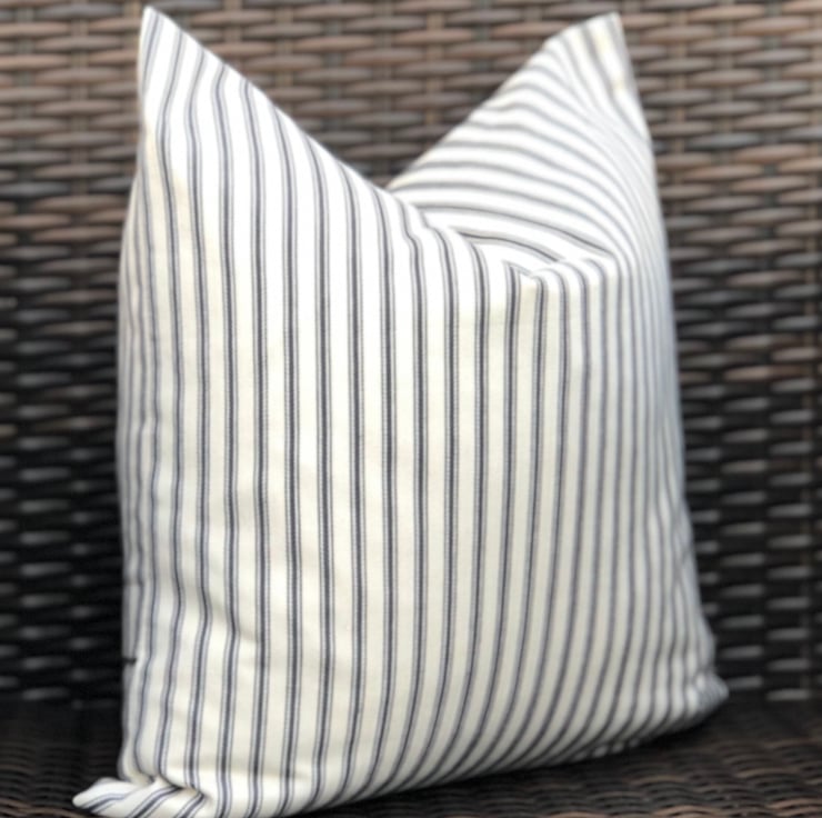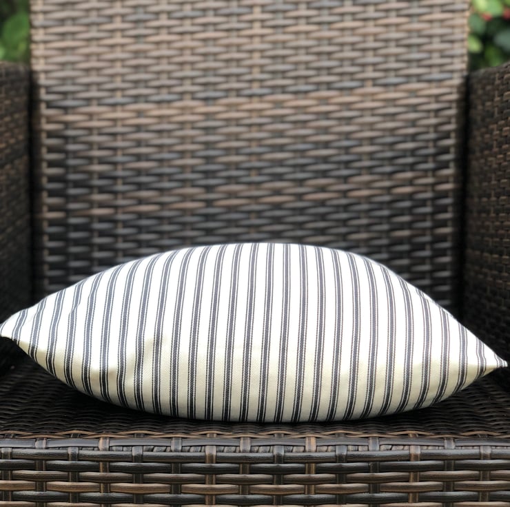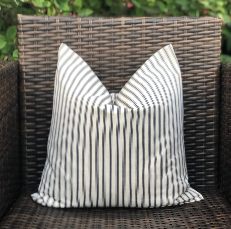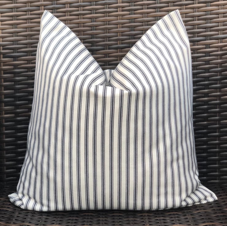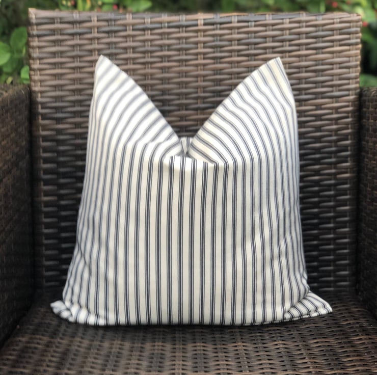 Black and cream traditional ticking striped cushion cover, with a simple envelope back, ideal for a black colour scheme. It had been made to fit a 46cm x 46cm (18” x 18”) cushion inner which is not included.