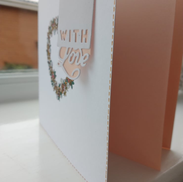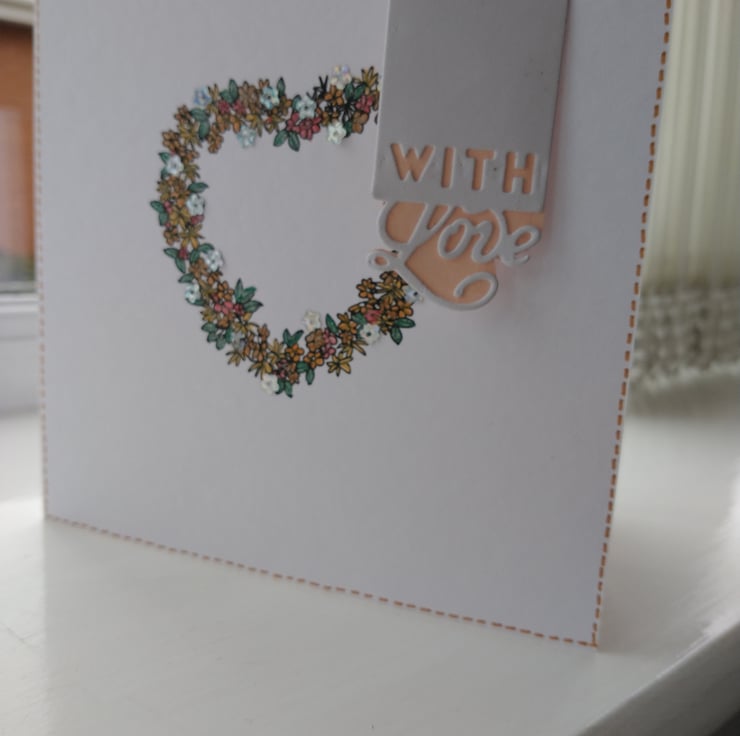 A completely handmade and uniquely designed card. Consisting of quality pristine white card which has had a heart full of flowers hand drawn in black ink. Coloured in by hand in shades orange. A with love tag dangles from white cotton. Finished off with flower shaped silver sequins