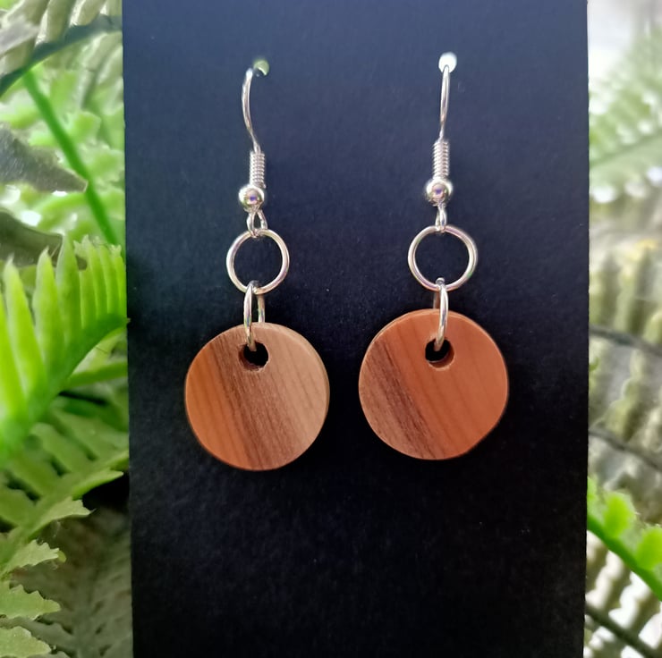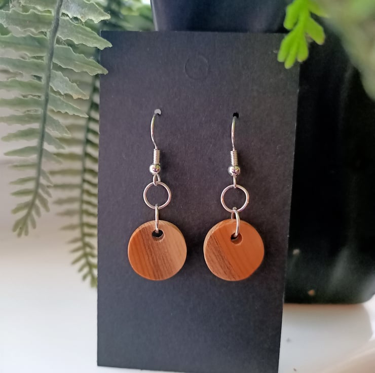 Circle disc round yew wood wooden earrings silver plate. Beautiful grain yellows and orange with cream and black make for a lovely classic wooden earring set. Made from yew wood, hand worked until smooth and silky and then combined with simple silver plate earrings, a lovely match indeed!