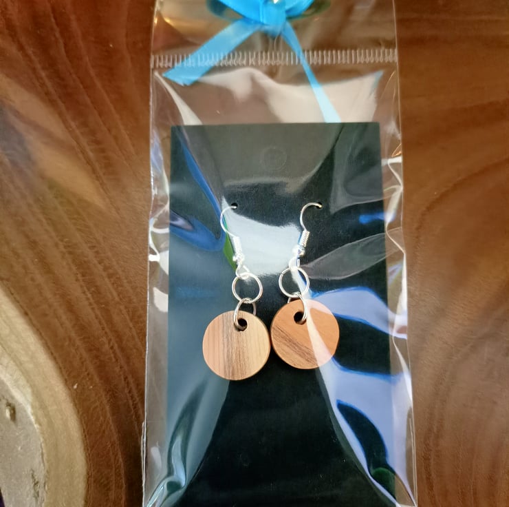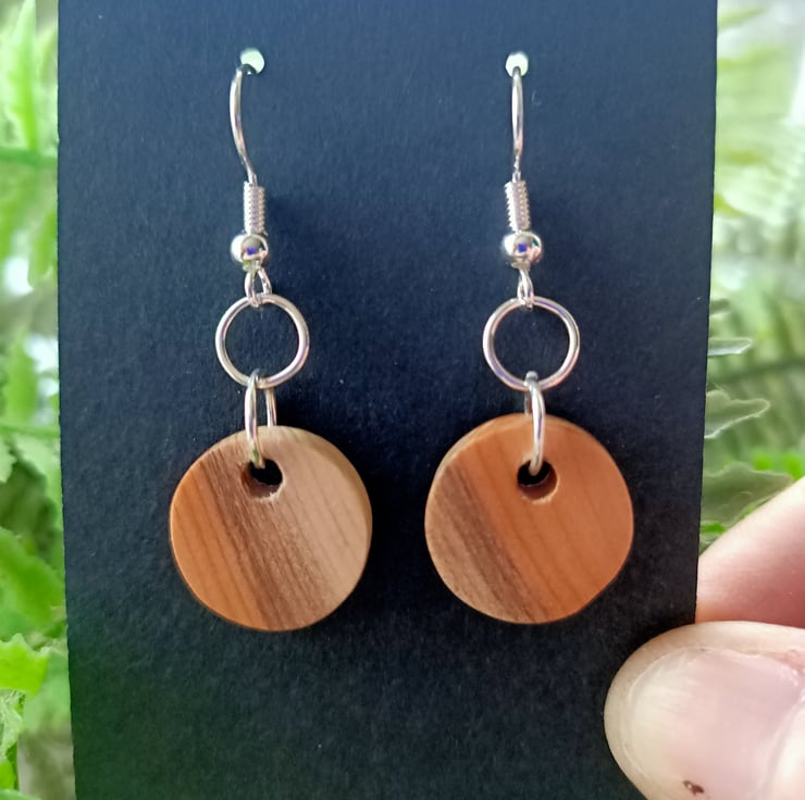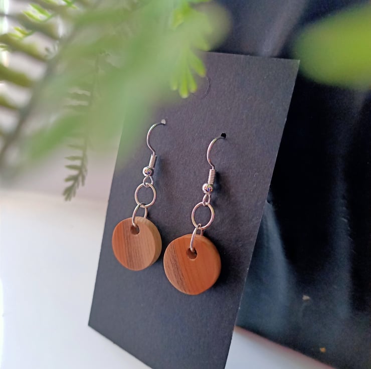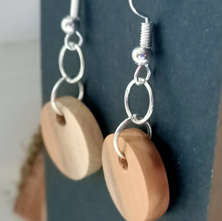 The wooden earrings have a long ball earring, two ring links and the wooden discs.