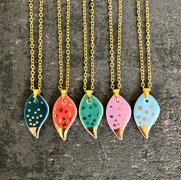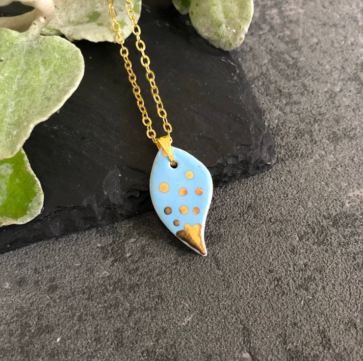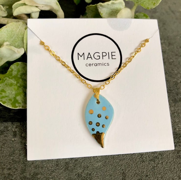 A ceramic pendant necklace made with a white earthenware clay, glazed in a vibrant glossy baby blue and finished with a genuine gold lustre decoration.