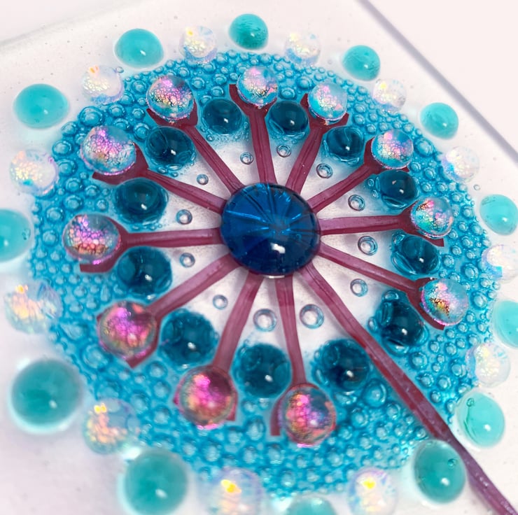 Fused glass hanging allium suncatcher. I've used tones of blue and turquoise in my fused glass suncatcher inspired by the alliums that grow in my garden. I've added detailed mint green leaves to this suncatcher to give a different look. This looks lovely hanging in a window. Each hanging is completely unique and would make a lovely gift to give a bit of colour and cheer to a friend or loved one.