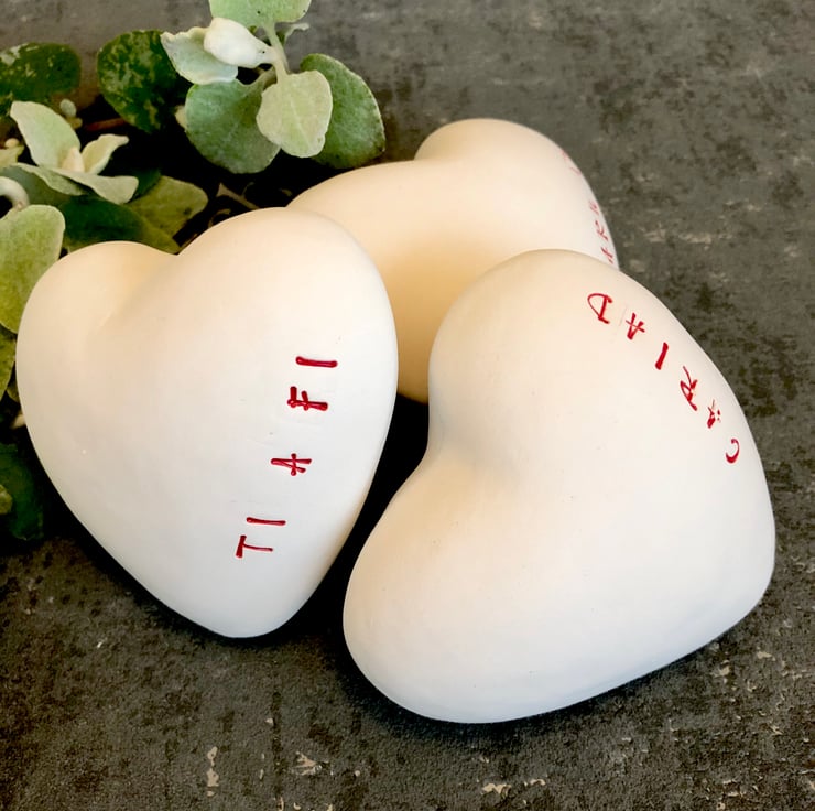A crisp white unglazed ceramic heart pebble, made in a white earthenware clay and finished with the Welsh word “Cariad” stamped and glazed in a deep glossy red.