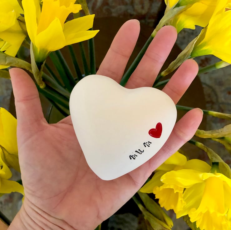 A crisp white unglazed ceramic heart pebble, made in a white earthenware clay and finished with a deep glossy red heart and the word “Mum” stamped and glazed in black.