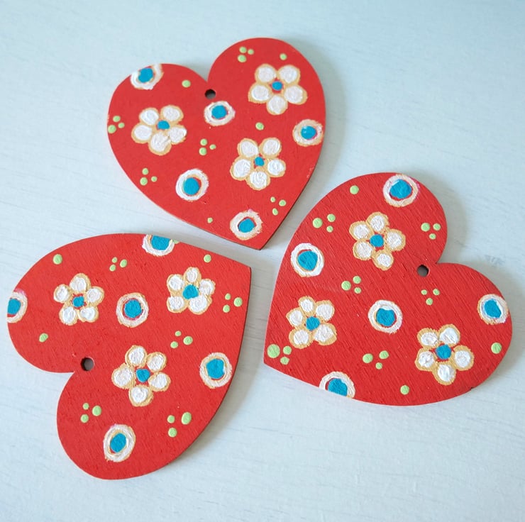 This is a listing for one red hanging heart handpainted by me with acrylic paints on plywood. The heart features off-white and turquoise flowers against a red background. The heart measures 3" x 3" (7.50cm x 7.50cm) and it is ready to hang on a wall or in your decorative tree.