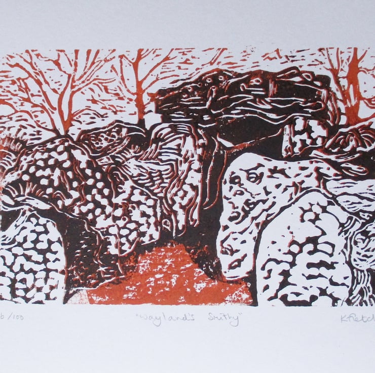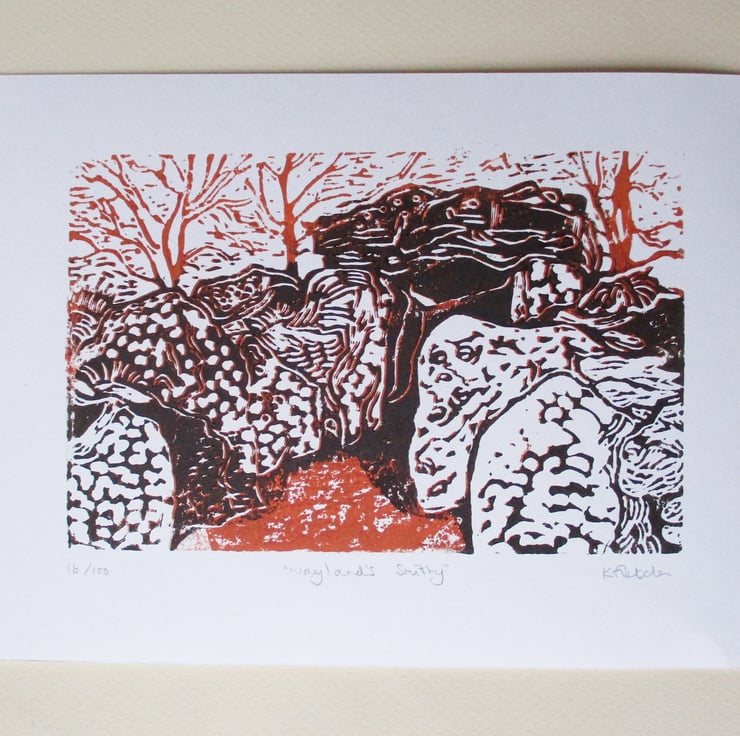 This is an original hand pressed linocut print of Wayland's Smithy, a chambered long barrow not far from the White Horse at Uffington.