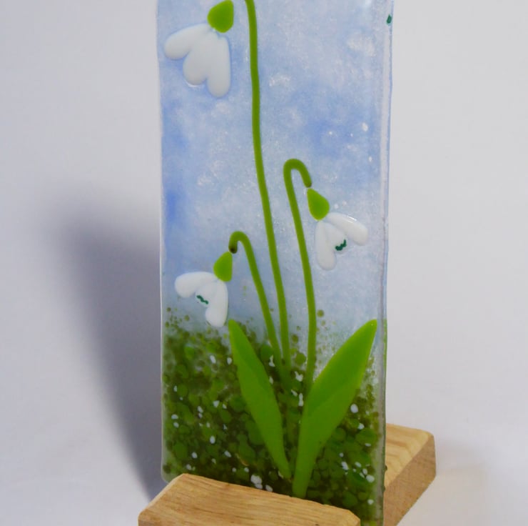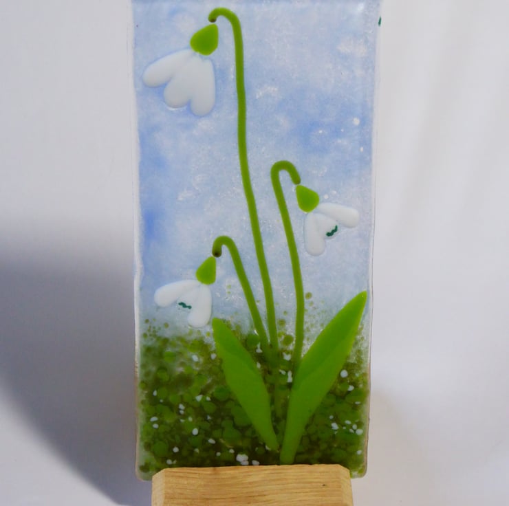 Fused Glass panel decorated with snowdrops and displayed in an oak stand with room for a tealight behind.