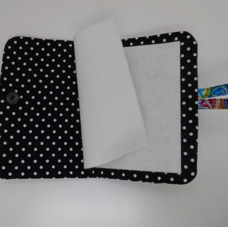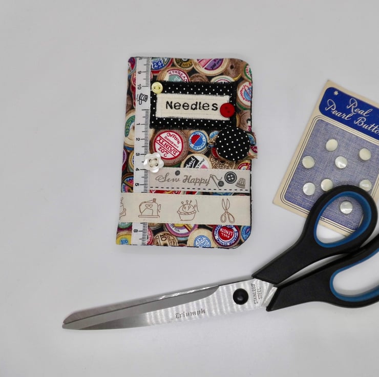 Use this little book to keep your needles neat and close at hand. I have made the cover using a cotton fabric printed with vintage style cotton reels. The lining is black with white spots.