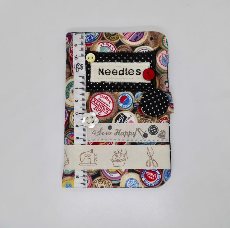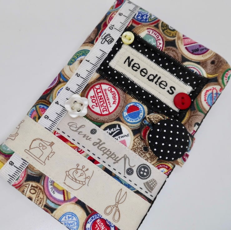 I have machine embroidered the word "Needles" in black thread onto cotton fabric and appliquéd this to the front on a patch of black fabric which has white dots. There's also a sprinkle of vintage buttons and sewing-themed ribbons for decoration.