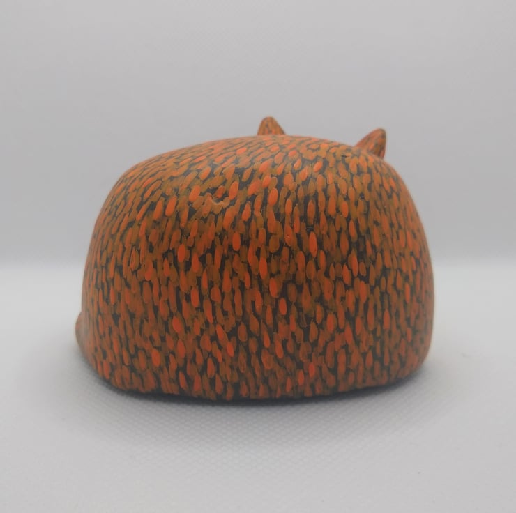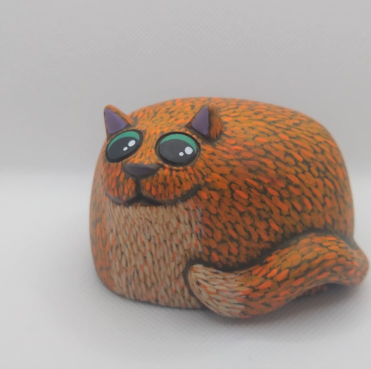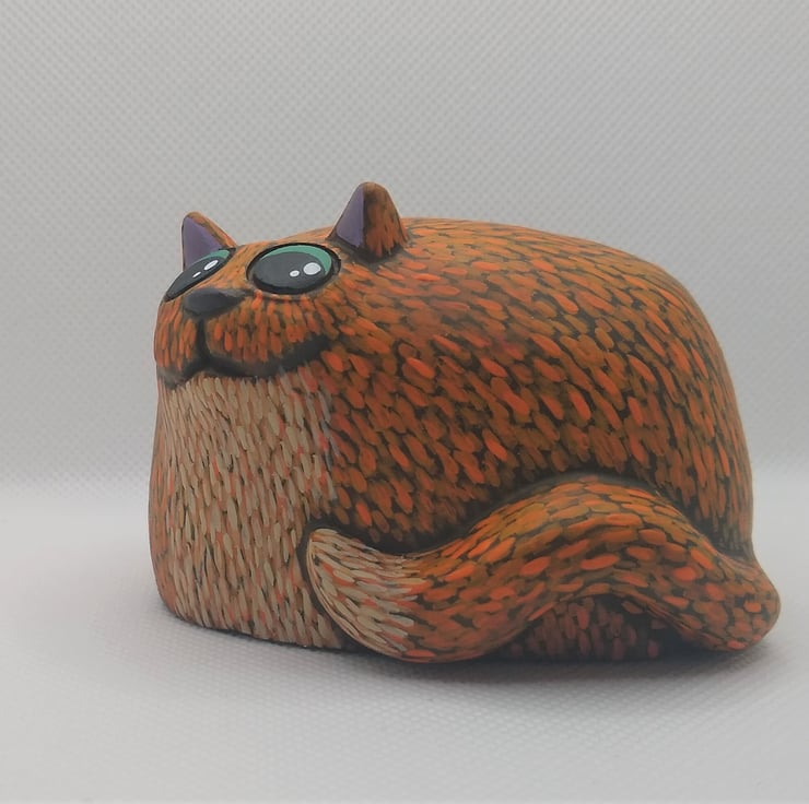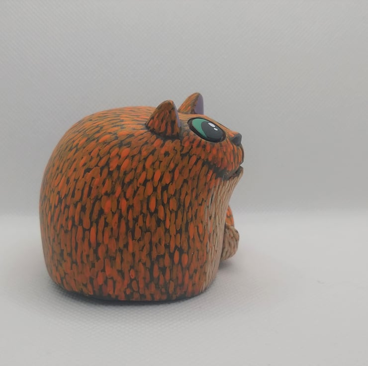 Starting life as a lump of Polymer Clay Charlie was sculpted and worked up into the cat like shape he wanted to be before being baked. he was then painted using acrylic paints before being sprayed with matte varnish to protect his paints finish. (he didn't mind that part too much).