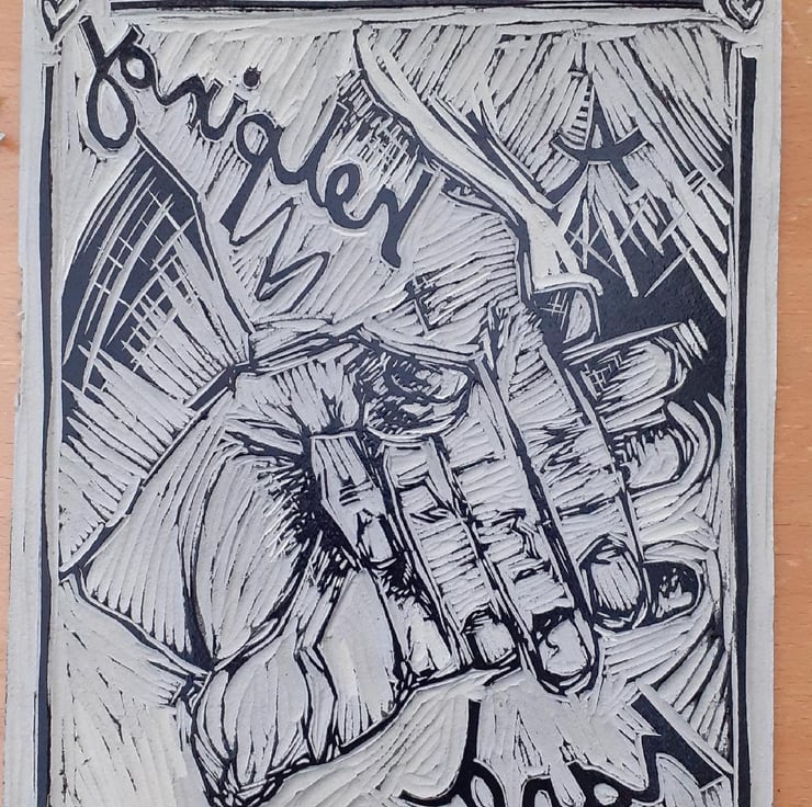 My work predominantly comprises hand cut and burnished lino prints, with sewing playing an occasional part.