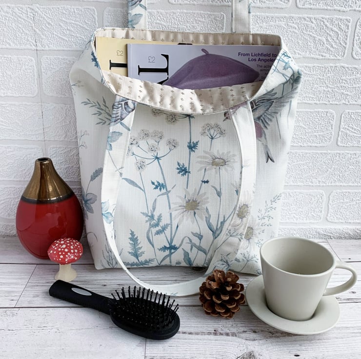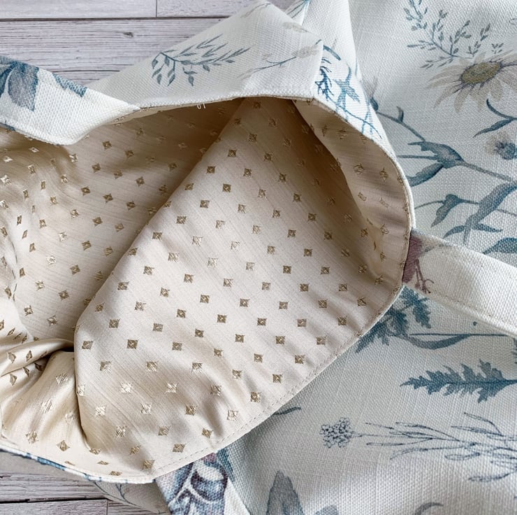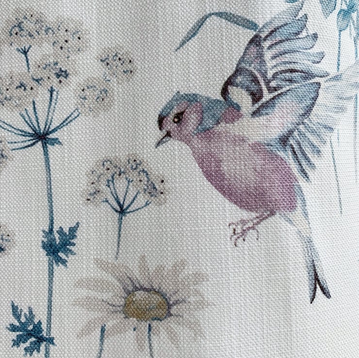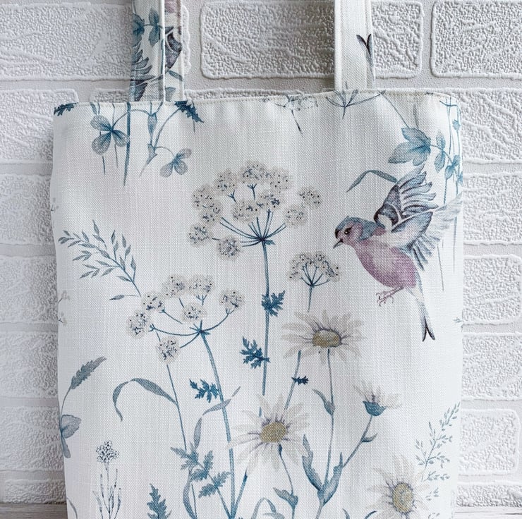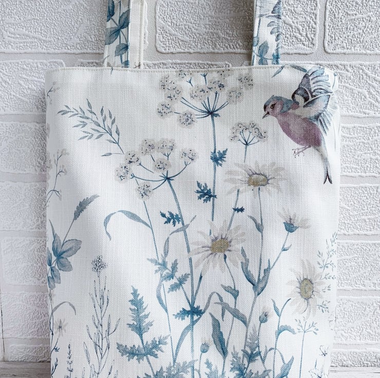 A tote bag with a chaffinch in a wild flower meadow. The tote bag is made from fabric with a delightful pastel print pattern on a cream background. The pattern shows a lovely blue-grey and dusky pink chaffinch flying amongst cow parsley, ox eye daisies and grasses. The plants are depicted in pretty pastel shades of blue, cream and golden yellow. The bag is lined with a lovely pale gold satin with a woven pattern of tiny diamonds.