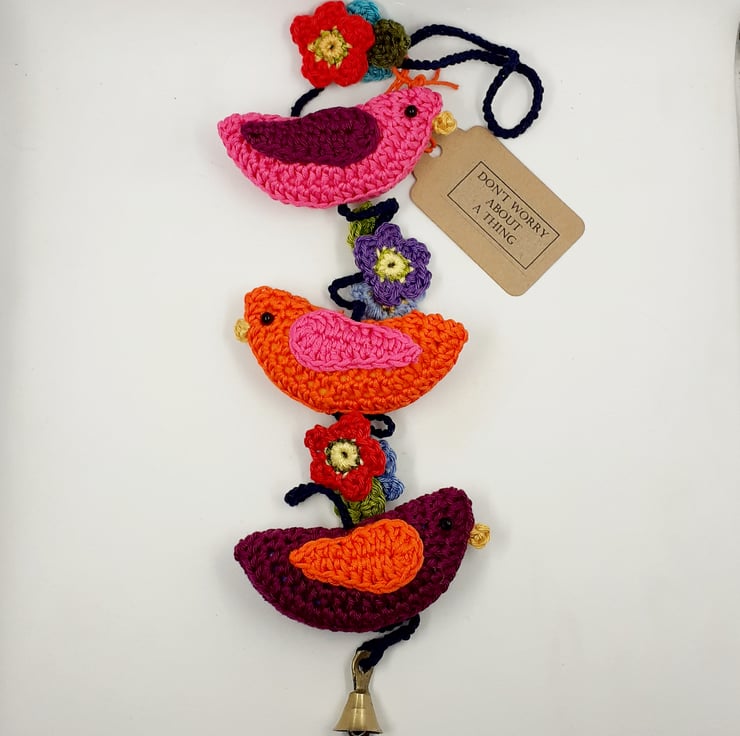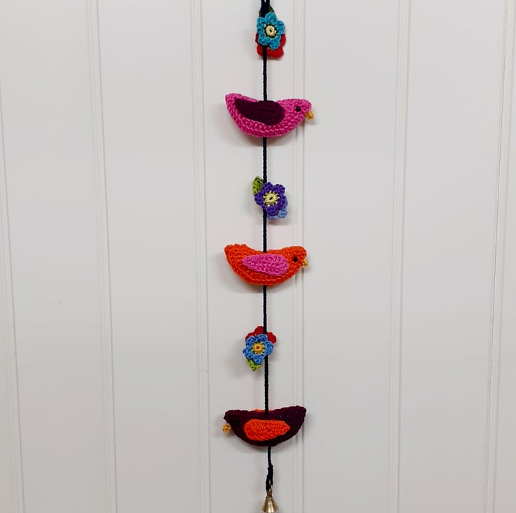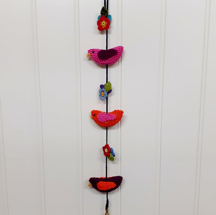 This cheerful hanging decoration would make a lovely gift to raise someone's spirits. It is crocheted in cotton and the birds are lined with felt and lightly filled with polyester stuffing. There is a brass bell at the bottom to add useful weight and a happy tinkle!