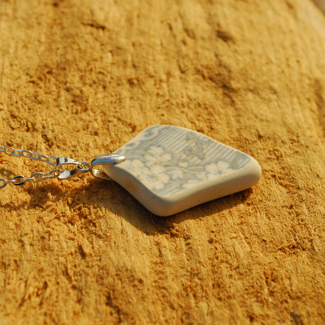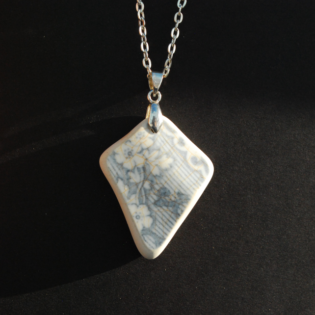 This is a lovely and rare example of transferware we found on the beach. It has come from the edge of an old plate or bowl, which is why it is slightly curved as can be seen in the photos. We have tumbled the pendant until it is rounded and smooth. In addition to the pretty flowers the pendant has a faint second pattern from the cracked glaze, which gives the piece a feeling of history and age. This pattern is barely noticeable from any distance.