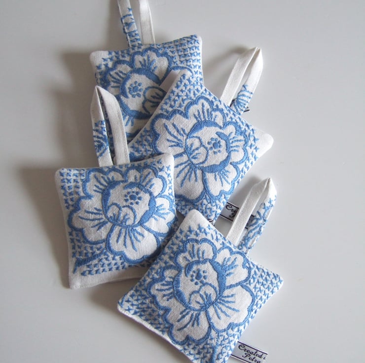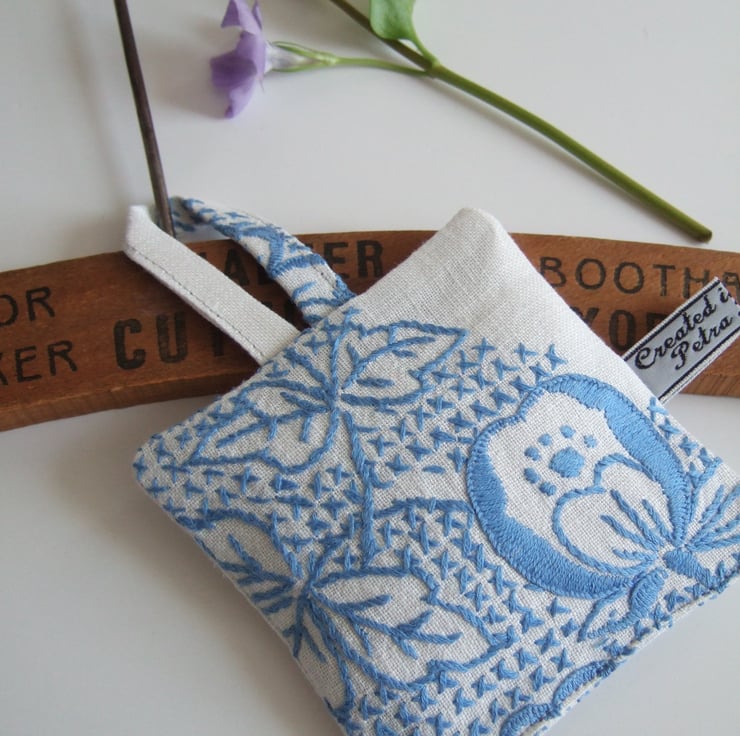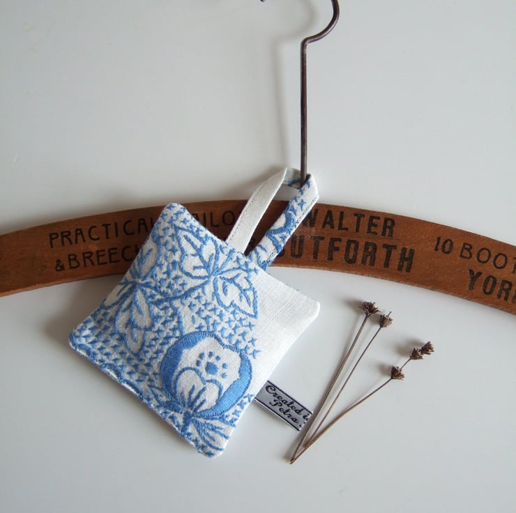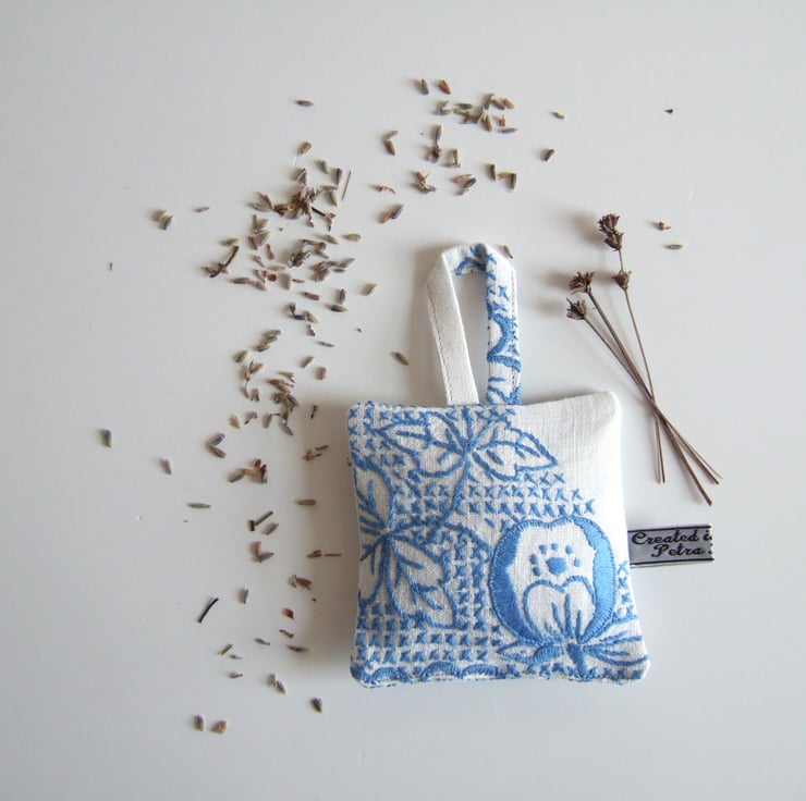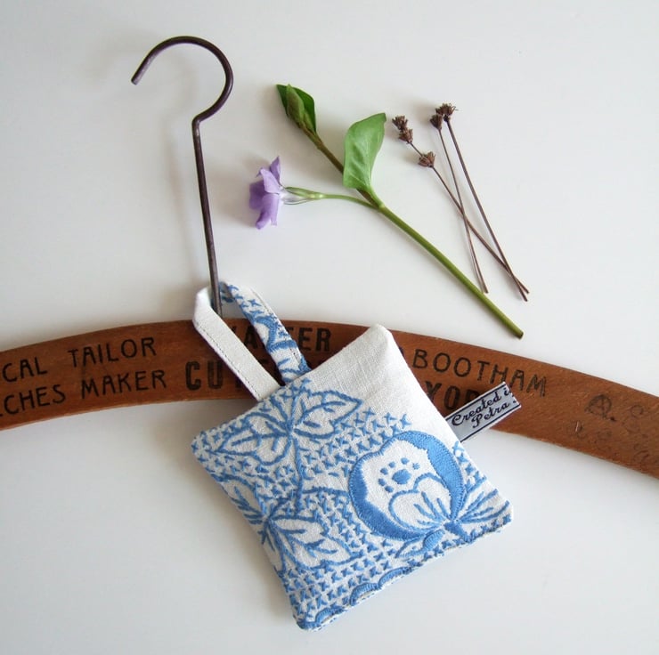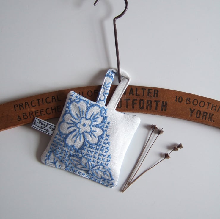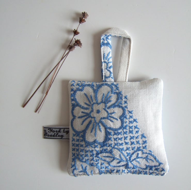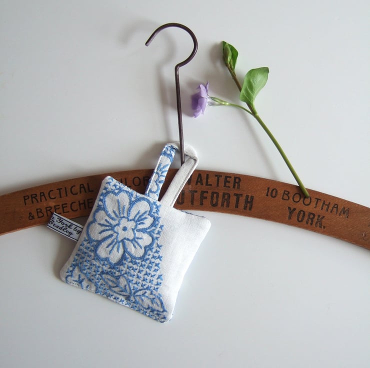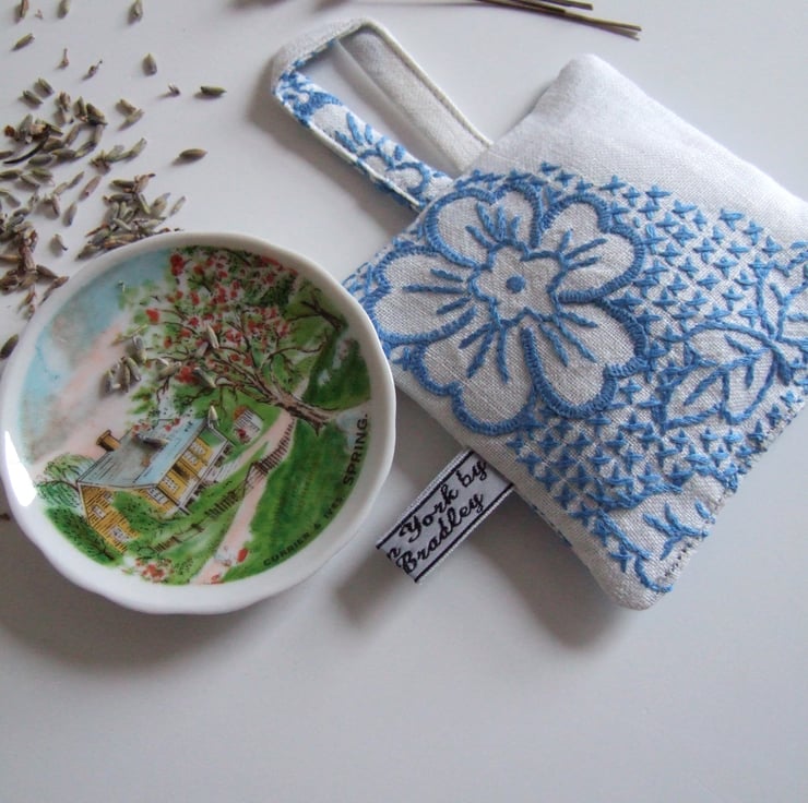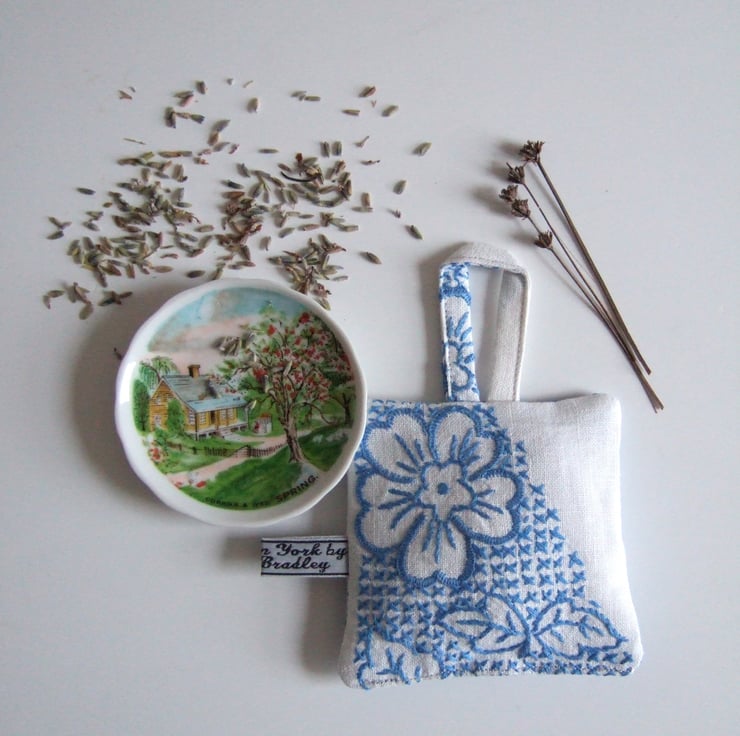 This pretty lavender bag is made from the corner of a lovely old tray cloth from a charity shop in York. Its vintage embroidery group of flowers is the perfect size for the front of a lavender bag. I have made the back from a different fragment of the same piece of linen, and filled it with dried lavender from Terrington in North Yorkshire. Since ancient times the lovely lavender has been used to help sleep, keep clothes smelling fresh, and shoo away pesky moths. Lovely to store in a drawer with a bridal gown, it would also make a nice present for a bridesmaid, as a gift for Mum or as a little virtual hug.