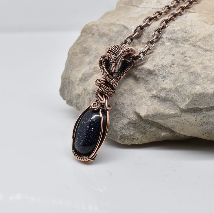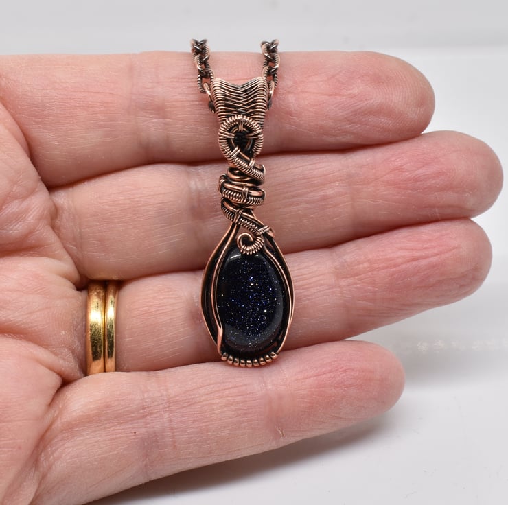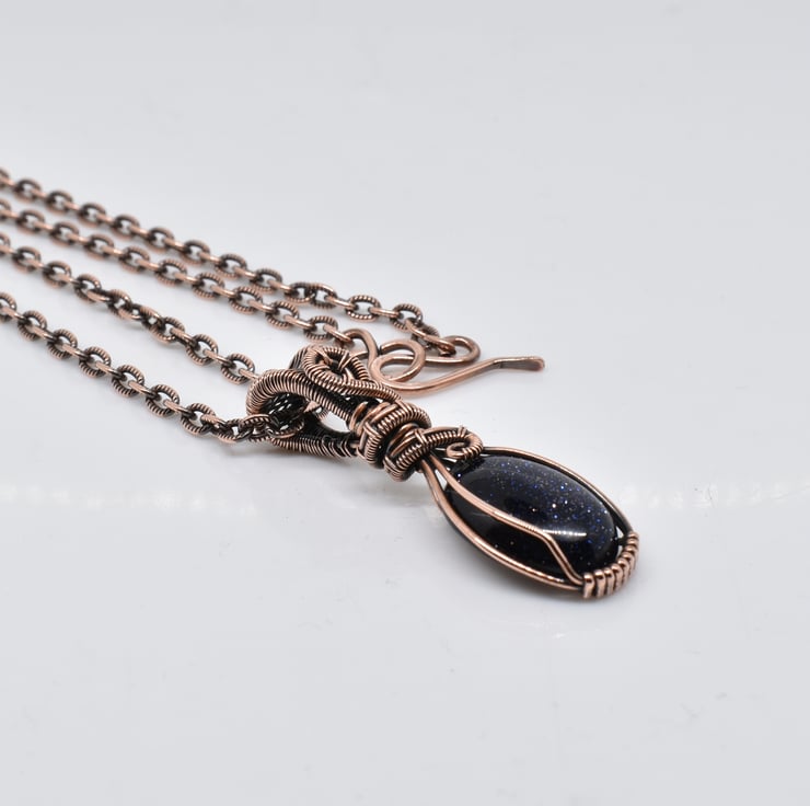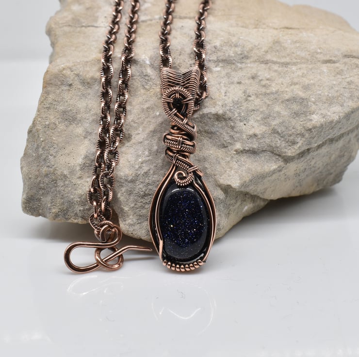 A sparkly blue goldstone I have wire wrapped and woven around using solid copper wire to make this dainty pendant which hangs from a copper chain with handmade clasp.