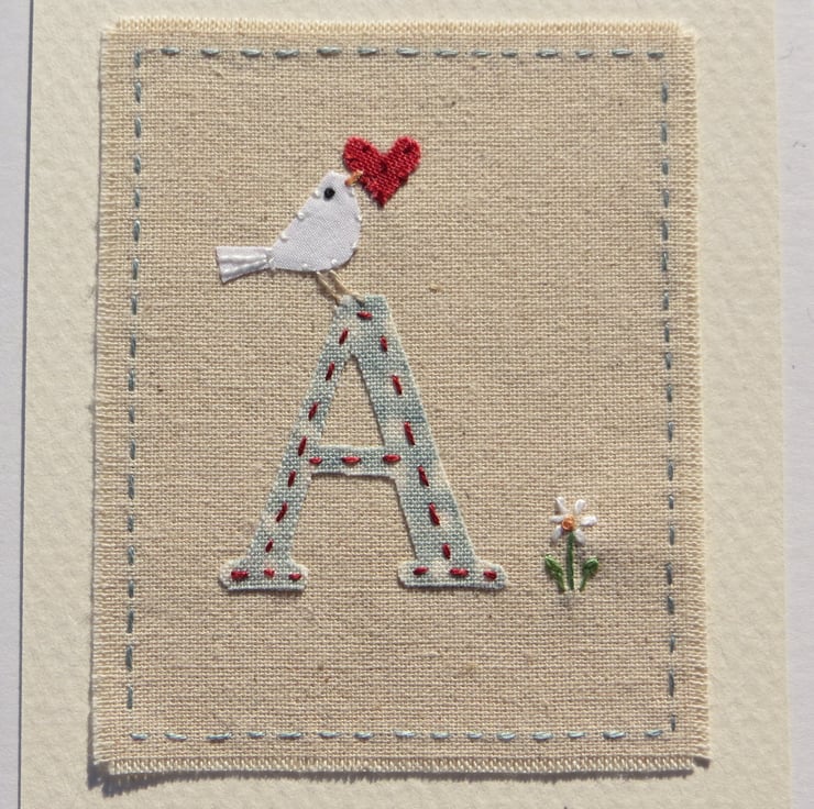 A hand-stitched card with the letter 'A' cut from pretty cotton fabric stitched into place with tiny stitches. I have added a miniature applique dove with heart in her beak, and then embroidered a tiny daisy flower to complete the design.