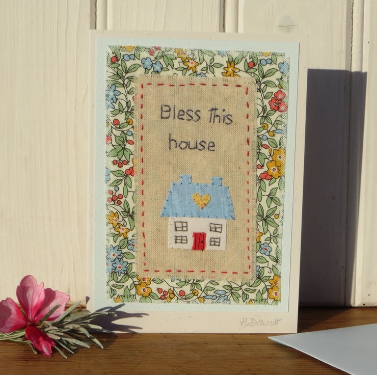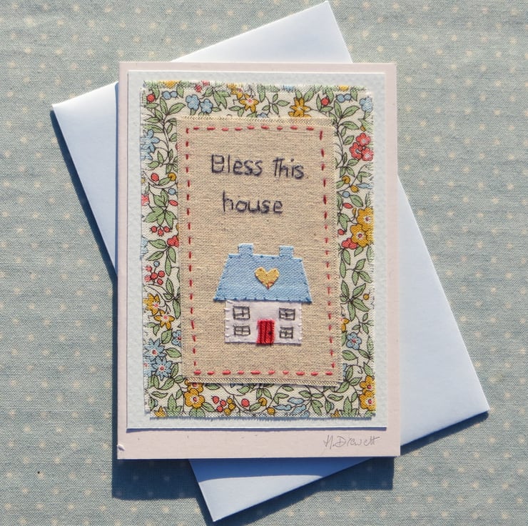 A handmade greeting card featuring a hand-stitched miniature applique house with stitched wording, backed with a beautiful Liberty cotton fabric. Perfect way to send your love and best wishes to anyone moving to a new home. (would look lovely framed too!).
