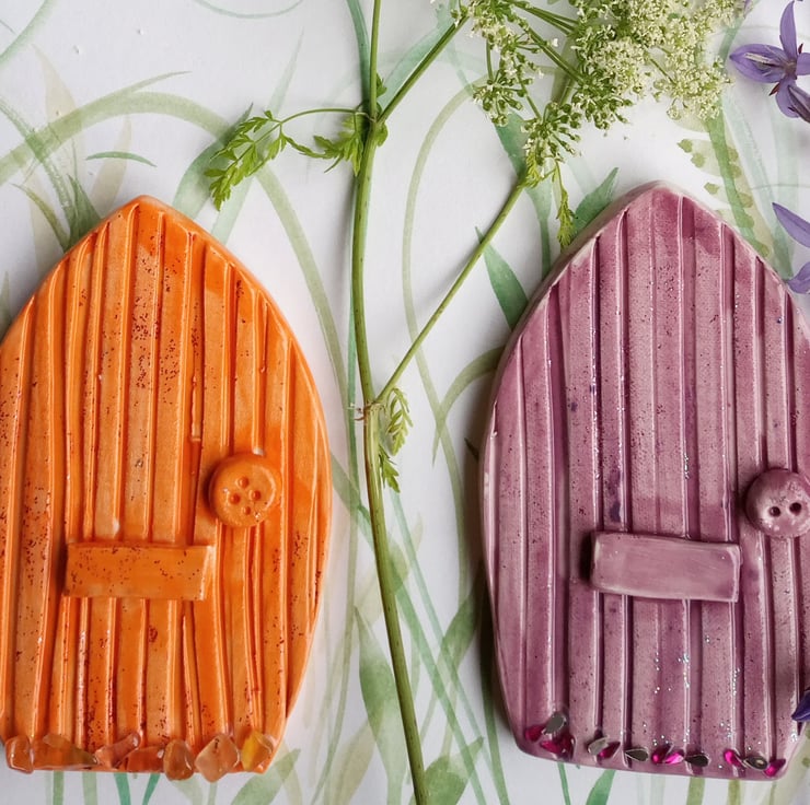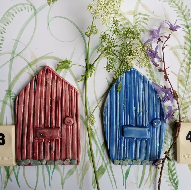 These ceramic fairy doors would look lovely in any child's bedroom. They are finished with a lovely glaze and embellished with either glitter, gems, semi precious stones. They are easy to attach to either a wall or skirting board, with glue dots attached to the back. The doors are approximately 6/7cm x 9/10 cm