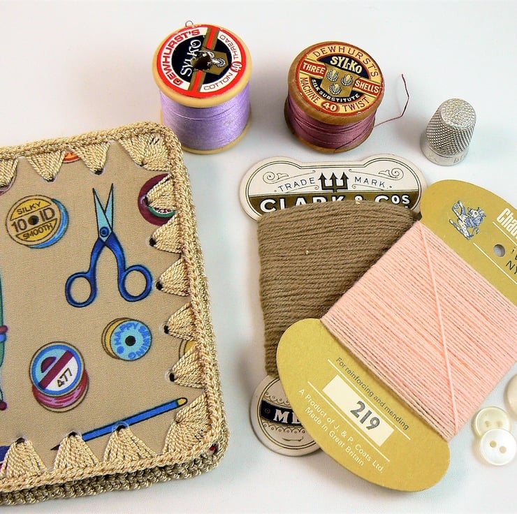 This needle case made from a sewing inspired print (inside and outer) sandwiched in between sheets of Acetate for a wipe clean finish, I have then crocheted the boarder in a pearl lustre crochet yarn and finished off with two sheet (four pages) of felt fabric inside to accommodate the needles.