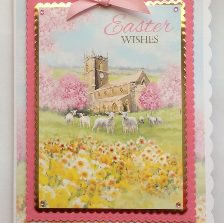 This is a lovely luxury 3D greeting card to say Happy Easter. The design features cute lambs and daffodils outside a church.