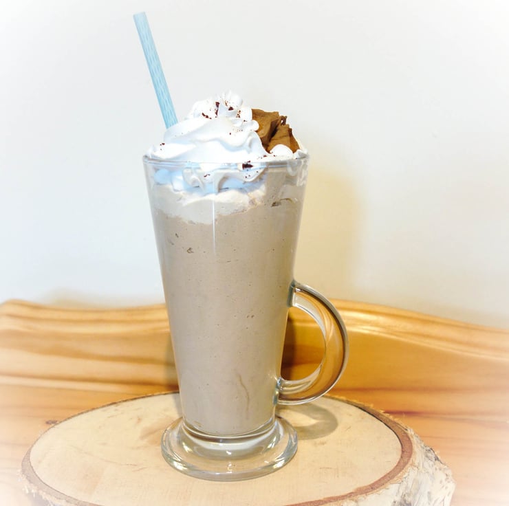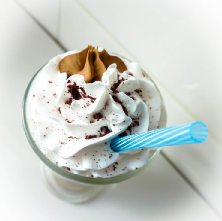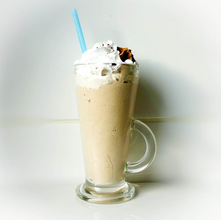 Fake Iced Latte with whipped fake cream topping and grated 'chocolate' embedded with a piped chocolate gem. Blue plastic straw.