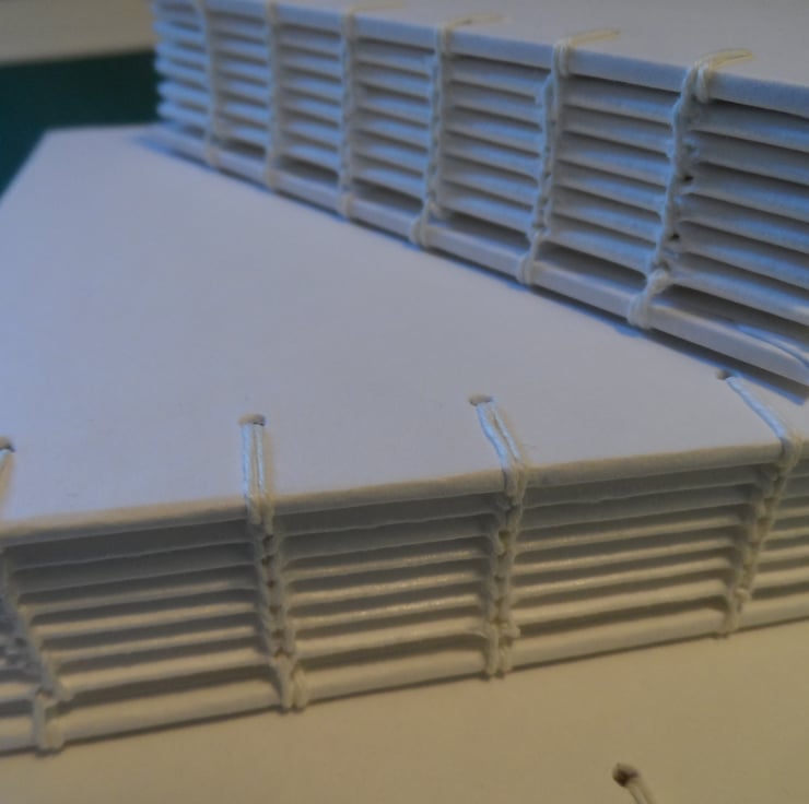 This is a handstitched book which I have bound using Coptic stitch and cream waxed linen thread. This style of binding allows the pages to open completely flat.