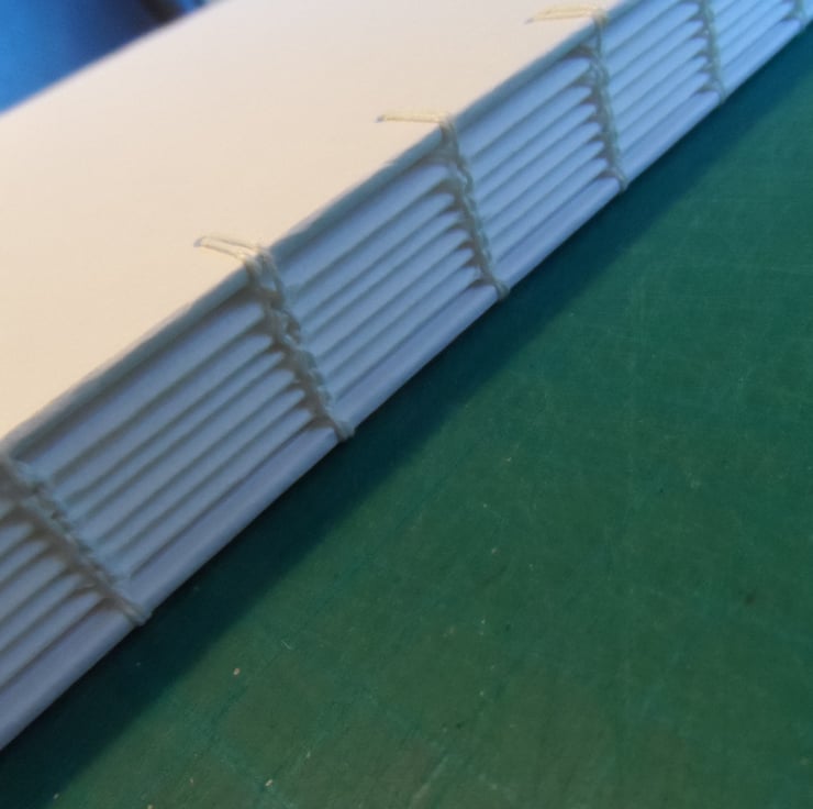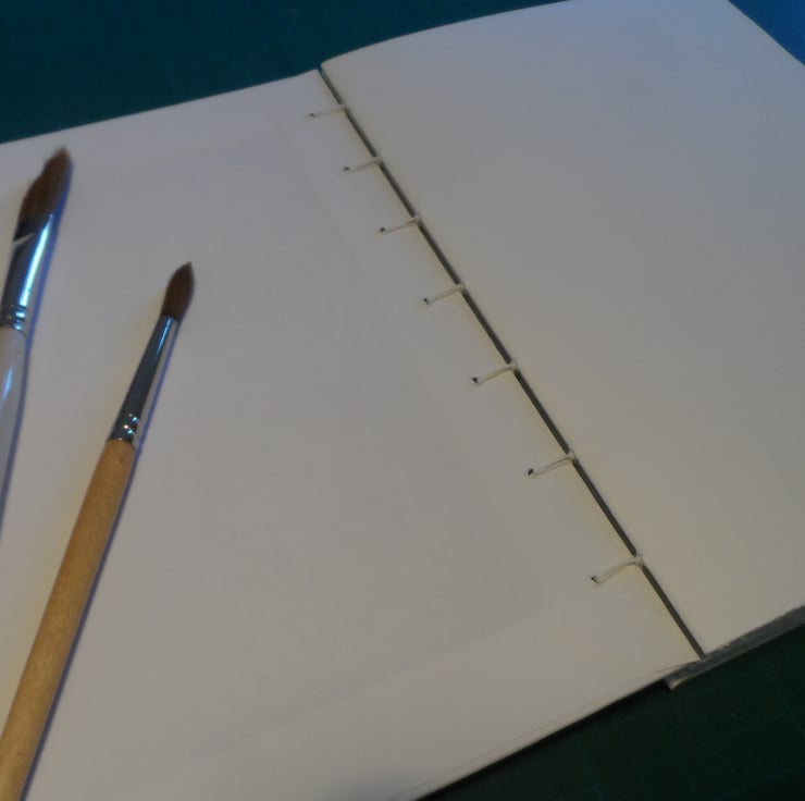 This is a handstitched book which I have bound using Coptic stitch and cream waxed linen thread. This style of binding allows the pages to open completely flat.